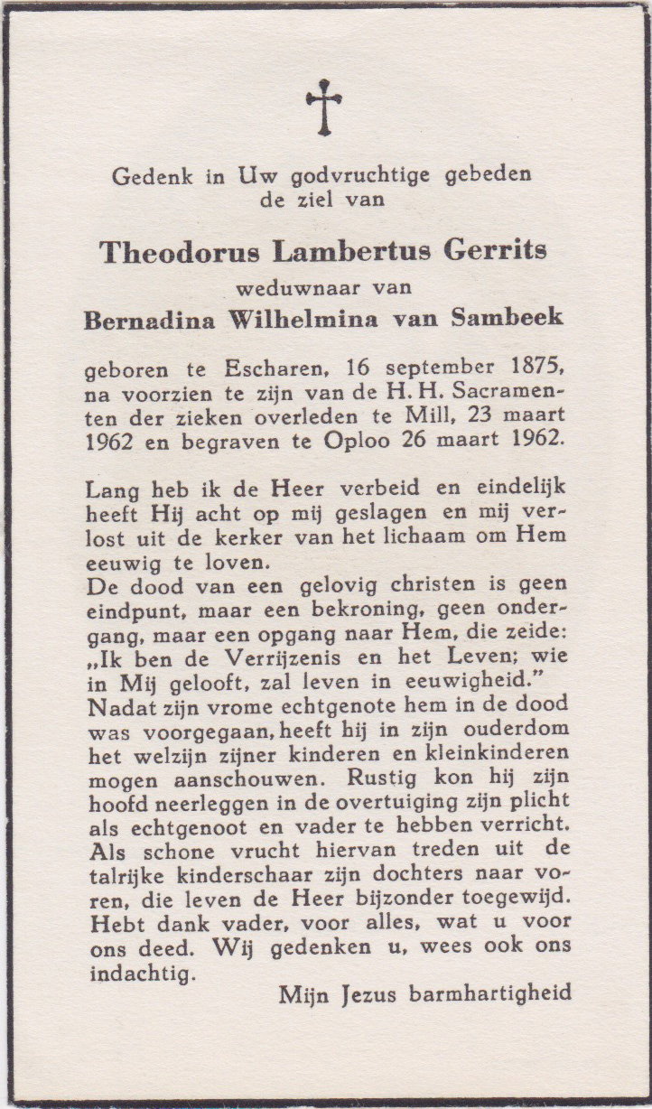 16-9-1875 23-3-1962 Gerrits, Theodorus Lambertus Doopnamen: Theodorus Lambertus Achternaam: Gerrits Geboren: 16-9-1875, Escharen Overleden: 23-3-1962, Mill Leeftijd: 86 Begrafenis/crematie te: Oploo Partner van: Bernardina W. van Sambeek Archiefnummer: 1-1-3