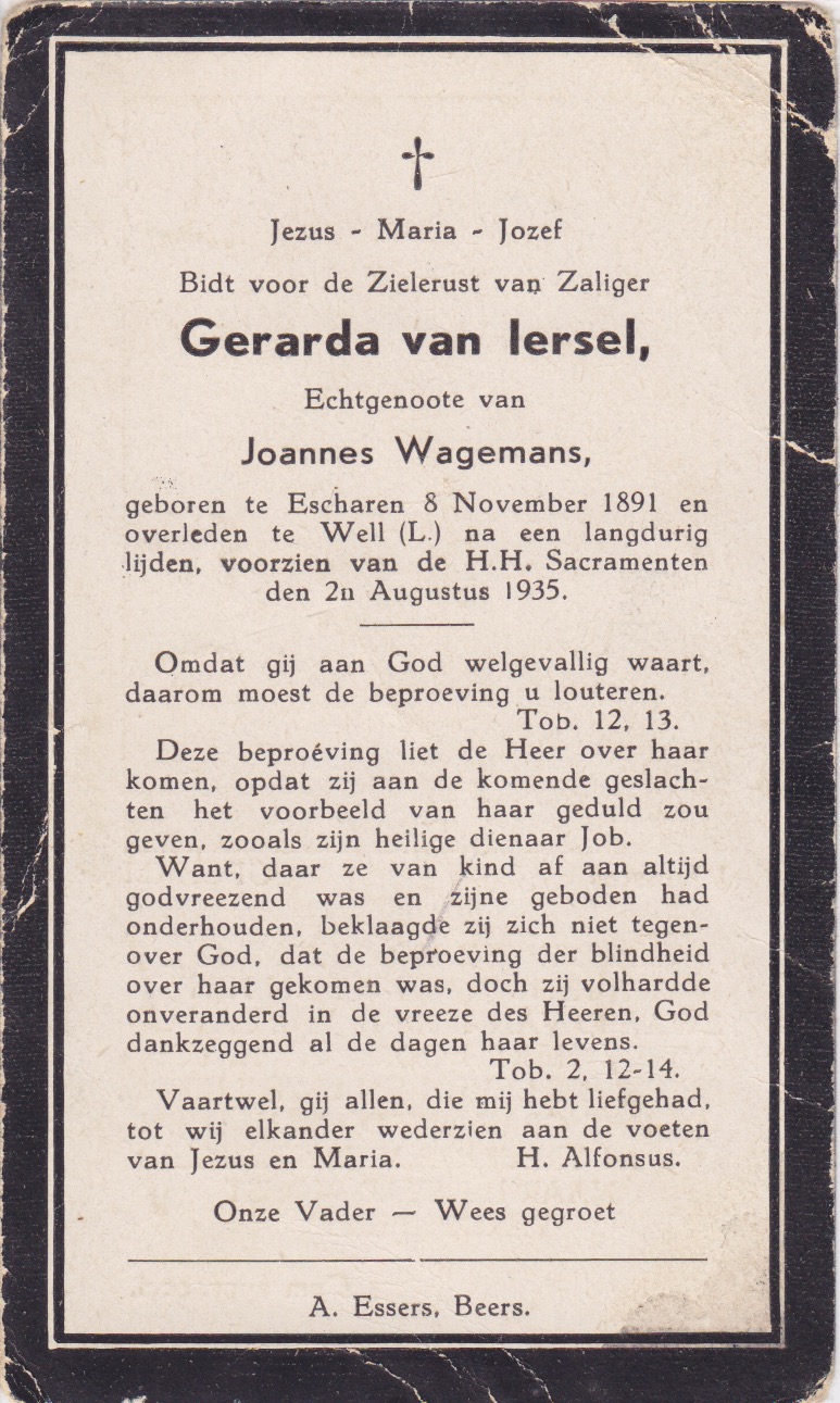 8-11-1891 2-8-1935 Iersel, Gerarda van Doopnamen: Gerarda Achternaam: van Iersel Geboren: 8-11-1891, Escharen Overleden: 2-8-1935, Well Leeftijd: 43 Partner van: Joannes Wagemans Archiefnummer: 1-11-2