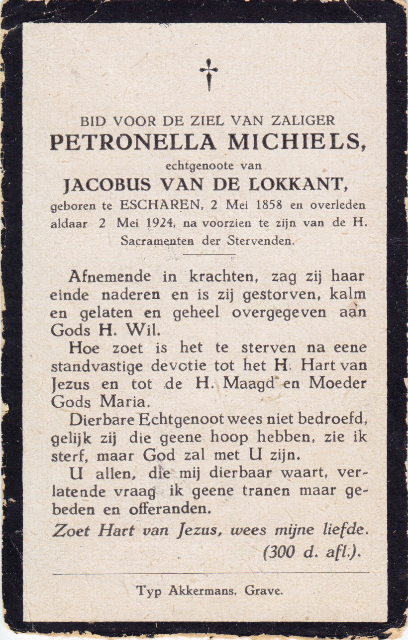 2-5-1858 2-5-1924 Michiels, Petronella Doopnamen: Petronella Achternaam: Michiels Geboren: 2-5-1858, Escharen Overleden: 2-5-1924, Escharen Leeftijd: 66 Begrafenis/crematie te: Escharen Partner van: Jacobus van de Lokkant Archiefnummer: 1-14-2