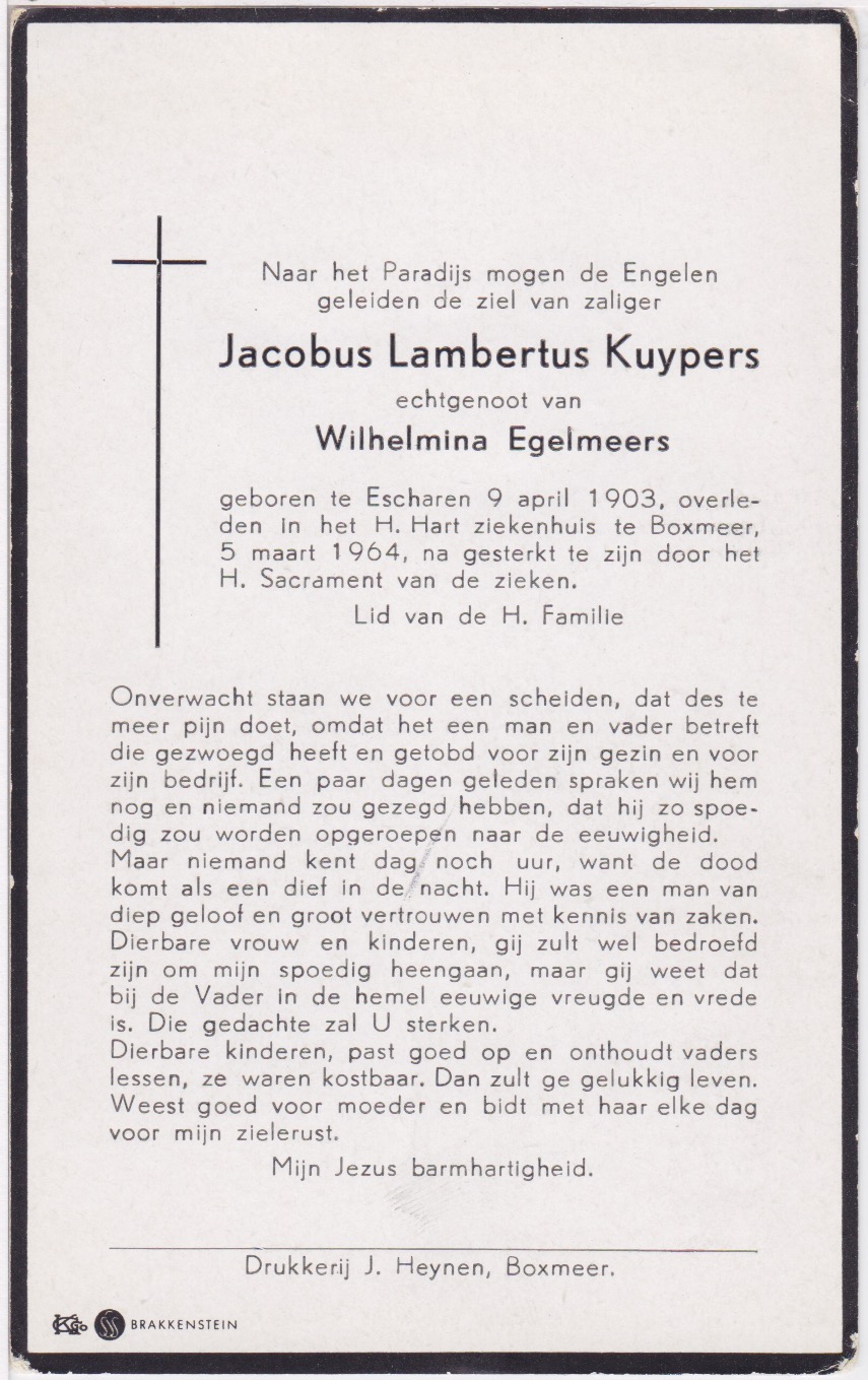 9-4-1903 5-3-1964 Kuypers, Jacobus Lambertus Doopnamen: Jacobus Lambertus Achternaam: Kuypers Geboren: 9-4-1903, Escharen Overleden: 5-3-1964, Boxmeer Leeftijd: 60 Partner van: Wilhelmina Egelmeeers Archiefnummer: 1-21-1