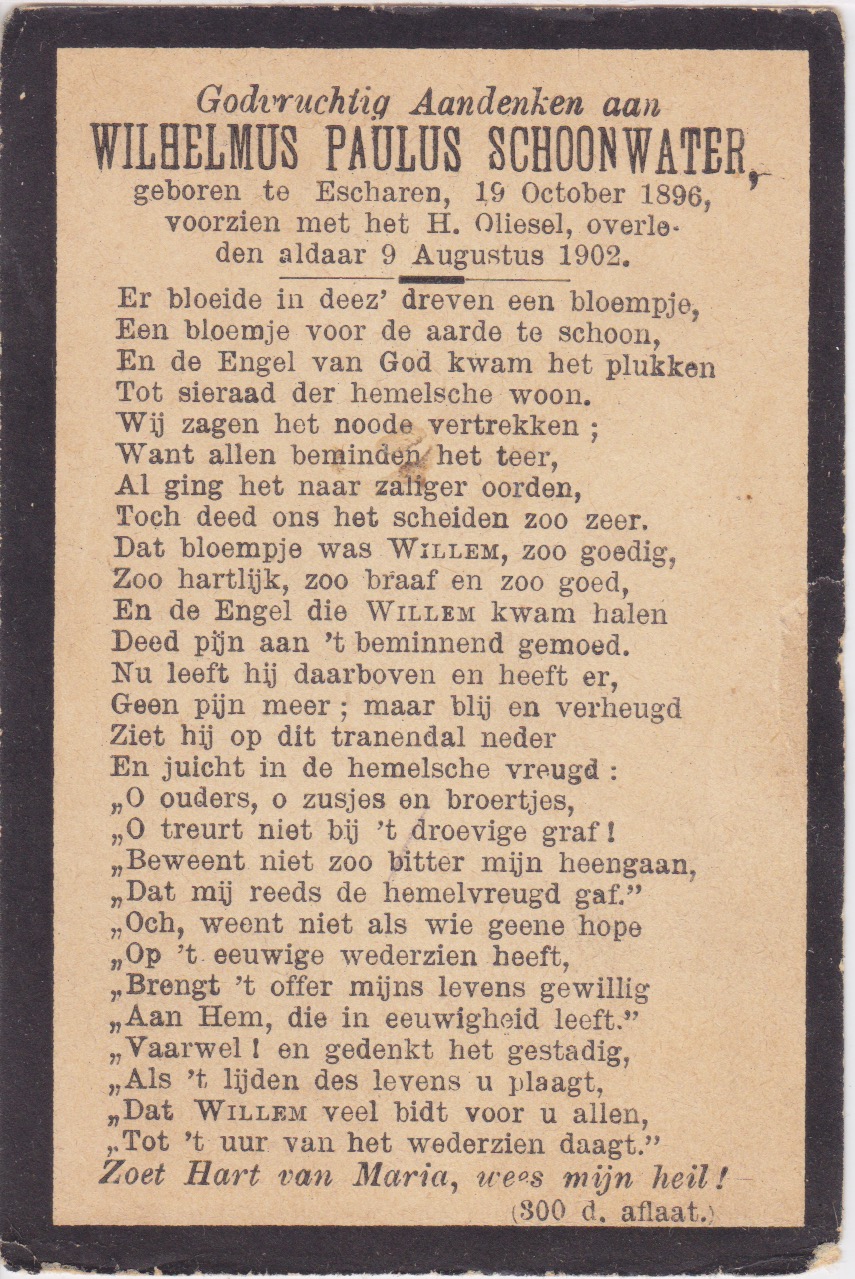 19-10-1896 9-8-1902 Schoonwater, Wilhelmus Paulus Doopnamen: Wilhelmus Paulus Achternaam: Schoonwater Geboren: 19-10-1896, Escharen Overleden: 9-8-1902, Escharen Leeftijd: 5 Begrafenis/crematie te: Escharen Archiefnummer: 1-21-6