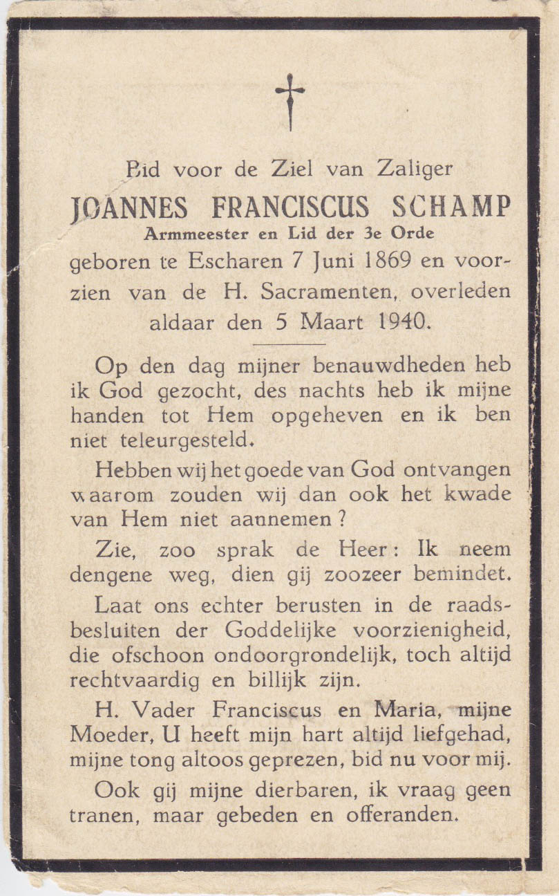 7-6-1869 5-3-1940 Schamp, Joannes Franciscus Doopnamen: Joannes Franciscus Achternaam: Schamp Geboren: 7-6-1869, Escharen Overleden: 5-3-1940, Escharen Leeftijd: 70 Begrafenis/crematie te: Escharen Archiefnummer: 1-22-1