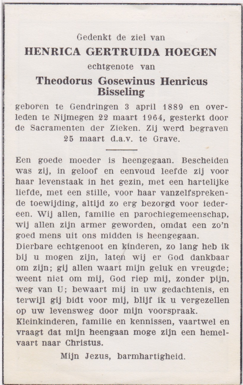 3-4-1889 22-3-1964 Hoegen, Henrica Gertruda Doopnamen: Henrica Gertruda Achternaam: Hoegen Geboren: 3-4-1889, Genderingen Overleden: 22-3-1964, Nijmegen Leeftijd: 74 Begrafenis/crematie te: Grave Partner van: Theodorus Bisseling Archiefnummer: 1-24-2