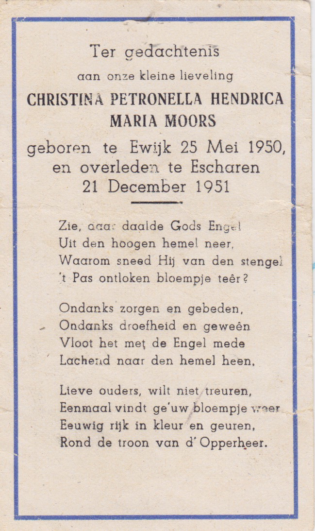 25-5-1950 21-12-1951 Moors, Christina Petronella Hendrica Maria Doopnamen: Christina Petronella Hendrica Maria Achternaam: Moors Geboren: 25-5-1950, Escharen Overleden: 21-12-1951, Escharen Leeftijd: 1 Begrafenis/crematie te: Escharen Archiefnummer: 1-25-1