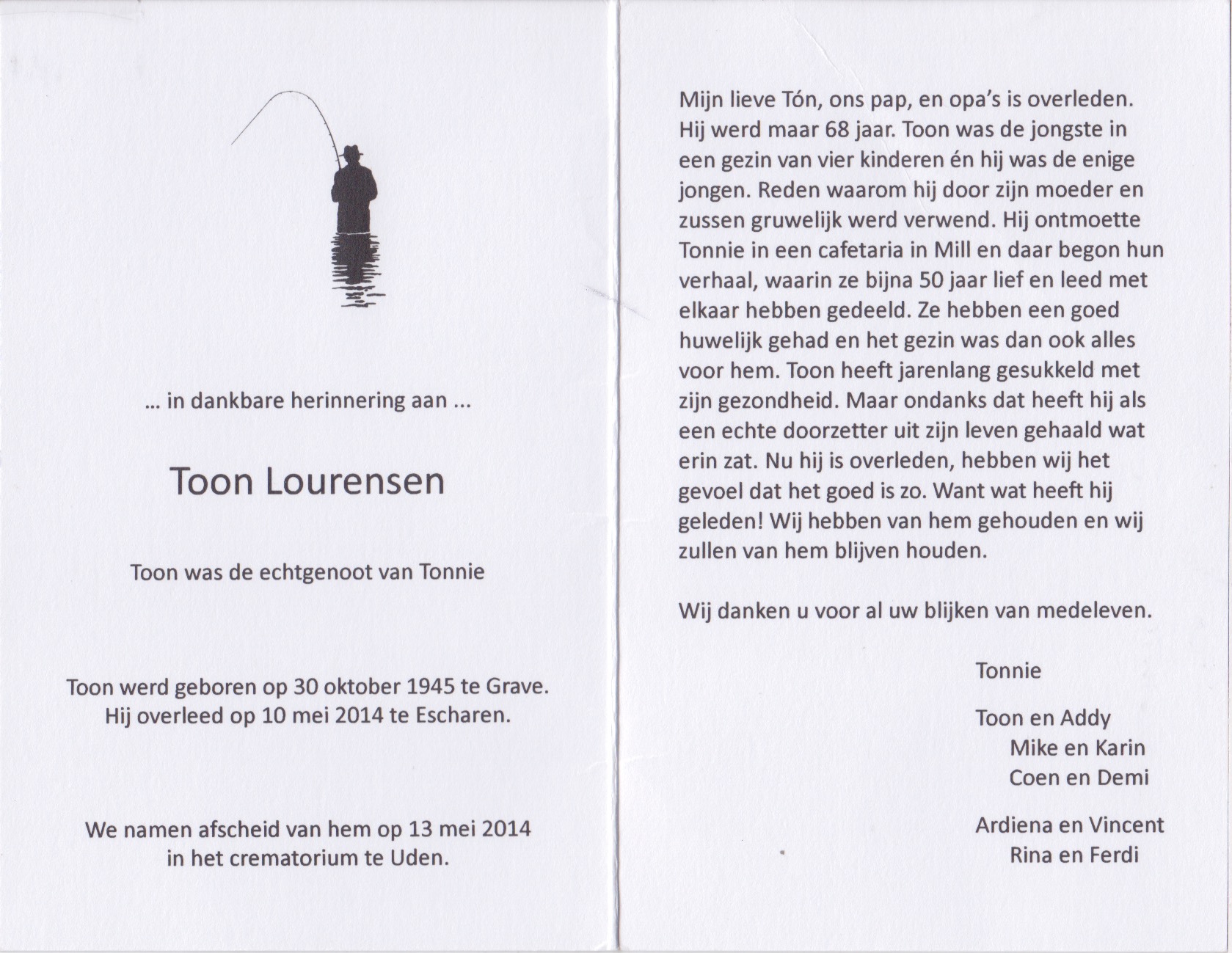 30-10-1945 10-5-2014 Lourensen, Toon Doopnamen: Toon Roepnaam: Toon Achternaam: Lourensen Geboren: 30-10-1945, Grave Overleden: 10-5-2014, Escharen Leeftijd: 68 Partner van: Tonnie Archiefnummer: 1-27-6 Terug