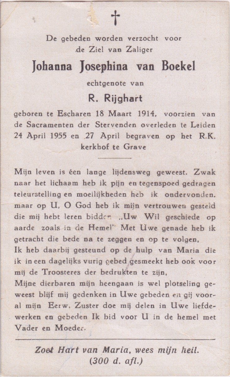 18-3-1914 24-4-1955 Boekel, Johanna Josephina van Doopnamen: Johanna Josephina Achternaam: van Boekel Geboren: 18-3-1914, Escharen Overleden: 24-4-1955, Leiden Leeftijd: 41 Begrafenis/crematie te: Grave Partner van: R. Rijghart Archiefnummer: 1-7-3