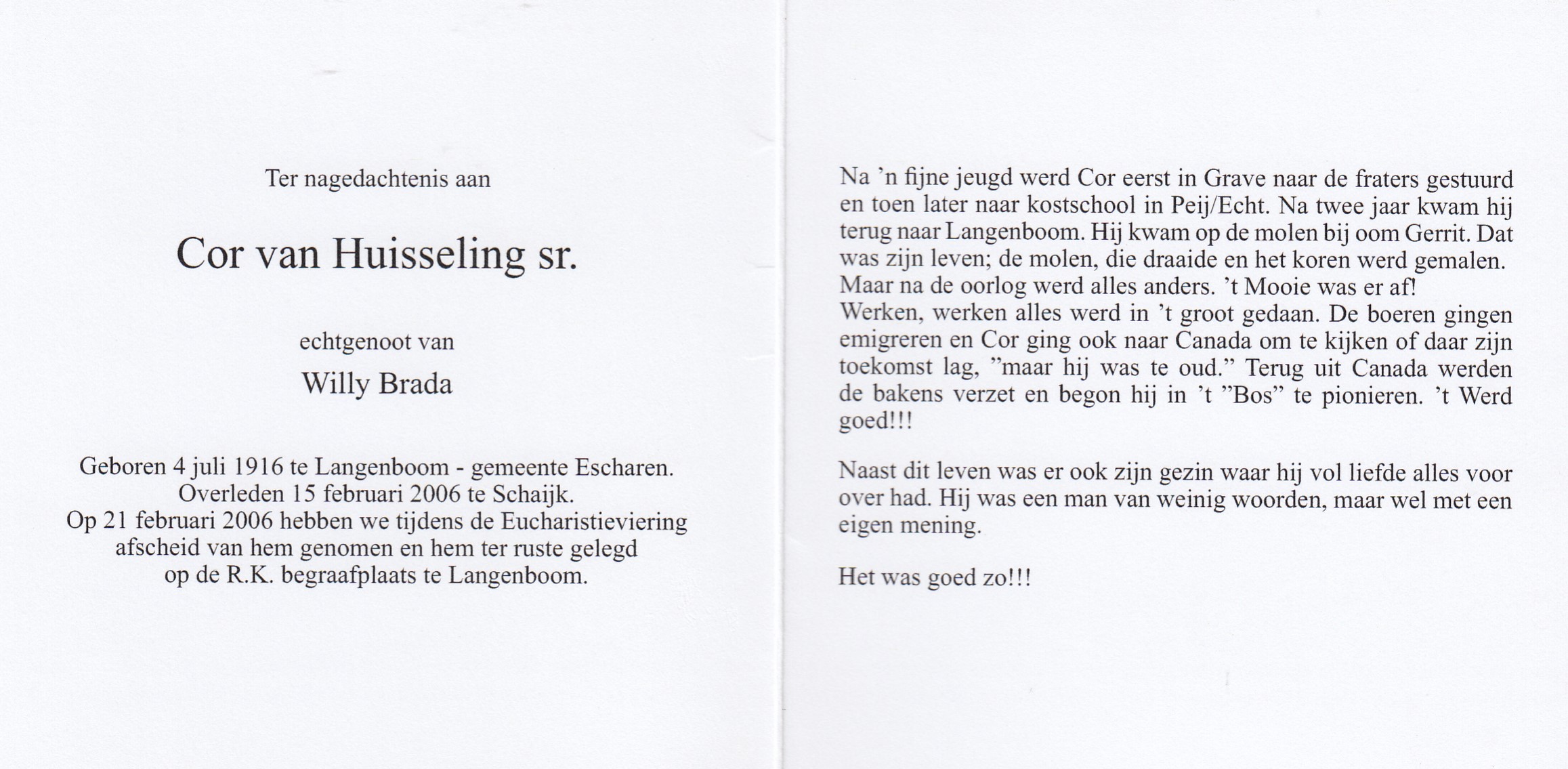 4-7-1916 21-2-2006 Huisseling, Cor van Doopnamen: Cor Roepnaam: Cor Achternaam: van Huisseling Geboren: 4-7-1916, Langenboom Overleden: 21-2-2006, Schaijk Leeftijd: 89 Begrafenis/crematie te: Langenboom Partner van: Willy Brada Archiefnummer: 10-6-3