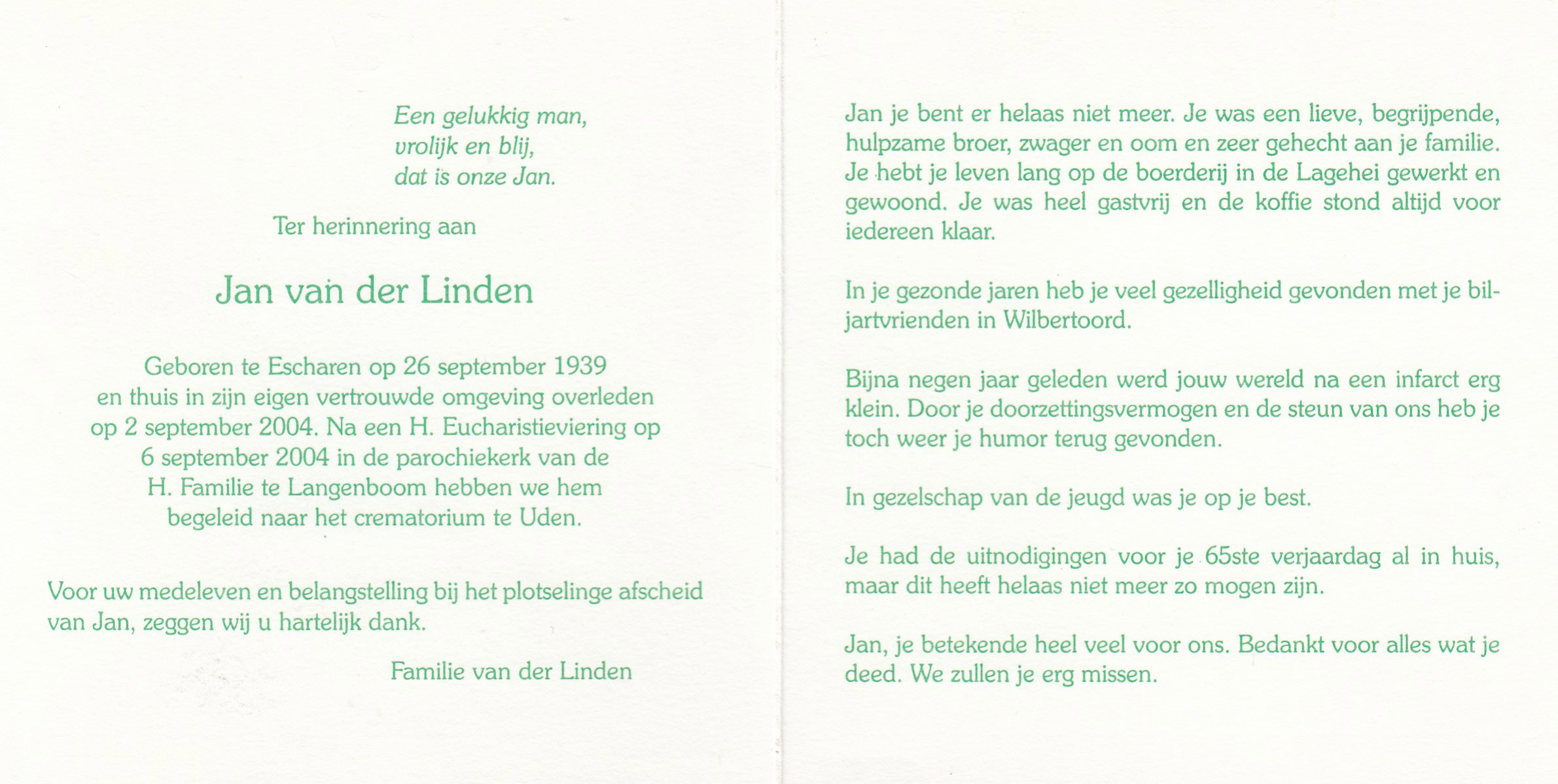 26-9-1939 2-9-2004 Linden, Jan van der Doopnamen: Jan Roepnaam: Jan Achternaam: van der Linden Geboren: 26-9-1939, Escharen Overleden: 2-9-2004, Langenboom Leeftijd: 64 Archiefnummer: 10-8-2