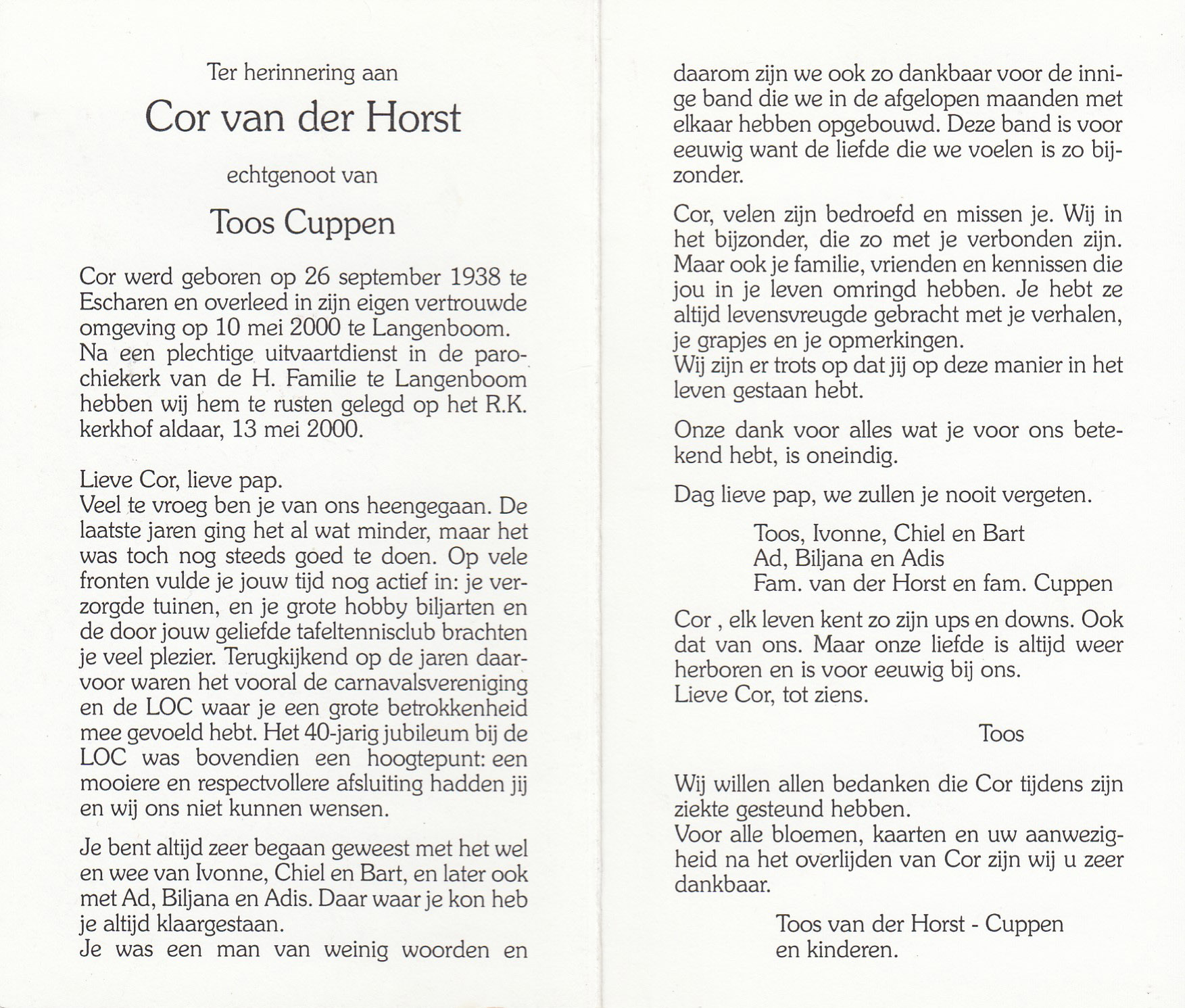 26-9-1938 13-5-2000 Horst, Cor van der Doopnamen: Carolus A.M. Roepnaam: Cor Achternaam: van der Horst Geboren: 26-9-1938, Escharen Overleden: 13-5-2000, Langenboom Leeftijd: 61 Begrafenis/crematie te: Langenboom Partner van: Toos Cuppen Archiefnummer: 11-1-3