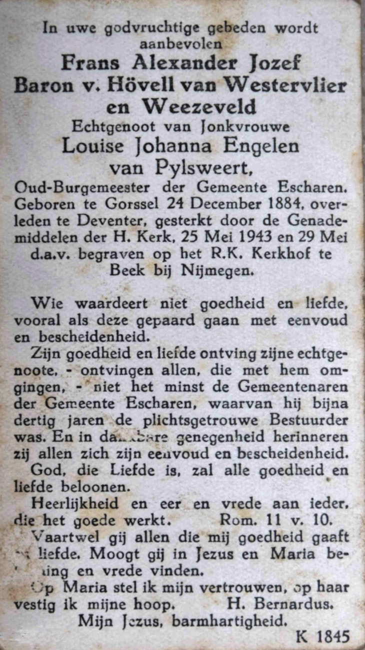 24-12-1884 25-5-1943 Hövell van Westervlier, Frans Alexander Jozef van Doopnamen: Frans Alexander Jozef Roepnaam: Baron Achternaam: van Hövell van Westervlier Geboren: 24-12-1884, Gorsel Overleden: 25-5-1943, Deventer Leeftijd: 58 Begrafenis/crematie te: Nijmegen Partner van: Jonkvrouwe Louise J. Engelen Archiefnummer: 11-13-2