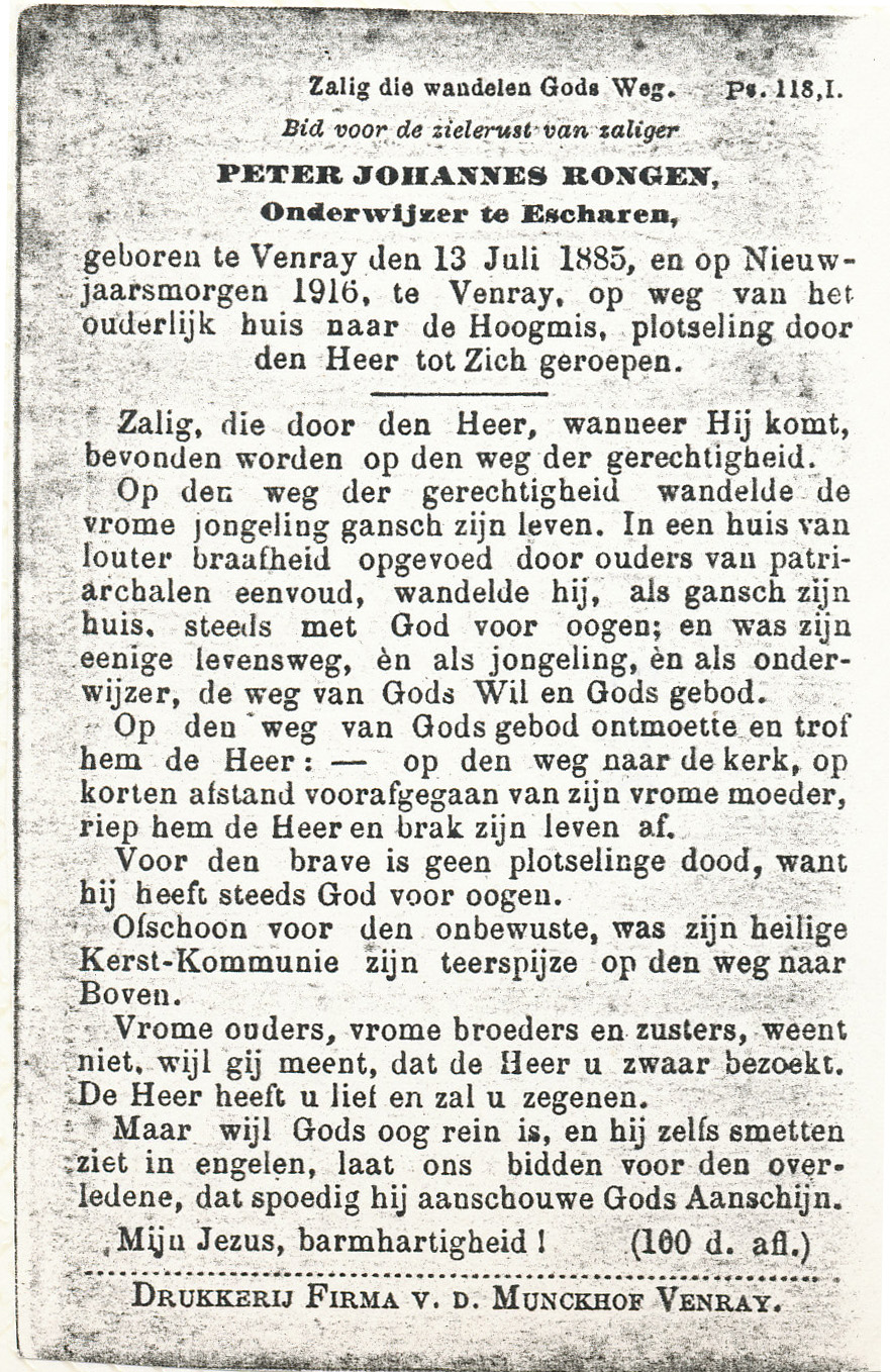 13-7-1885 1-1-1916 Rongen, Peter Johannes Doopnamen: Peter Johannes Achternaam: Rongen Geboren: 13-7-1885, Venray Overleden: 1-1-1916, Venray Leeftijd: 30 Begrafenis/crematie te: Venray Archiefnummer: 11-14-2 k