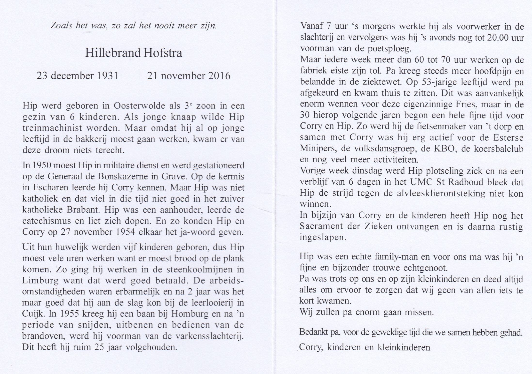 23-12-1931 21-11-2016 Hofstra, Hillebrand Doopnamen: Hillebrand Roepnaam: Hip Achternaam: Hofstra Geboren: 23-12-1931, Oosterwolde Overleden: 21-11-2016, Escharen Leeftijd: 84 Partner van: Corry Verweijen Archiefnummer: 11-15-3
