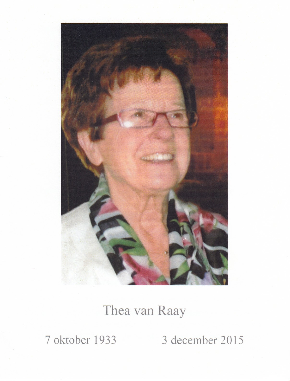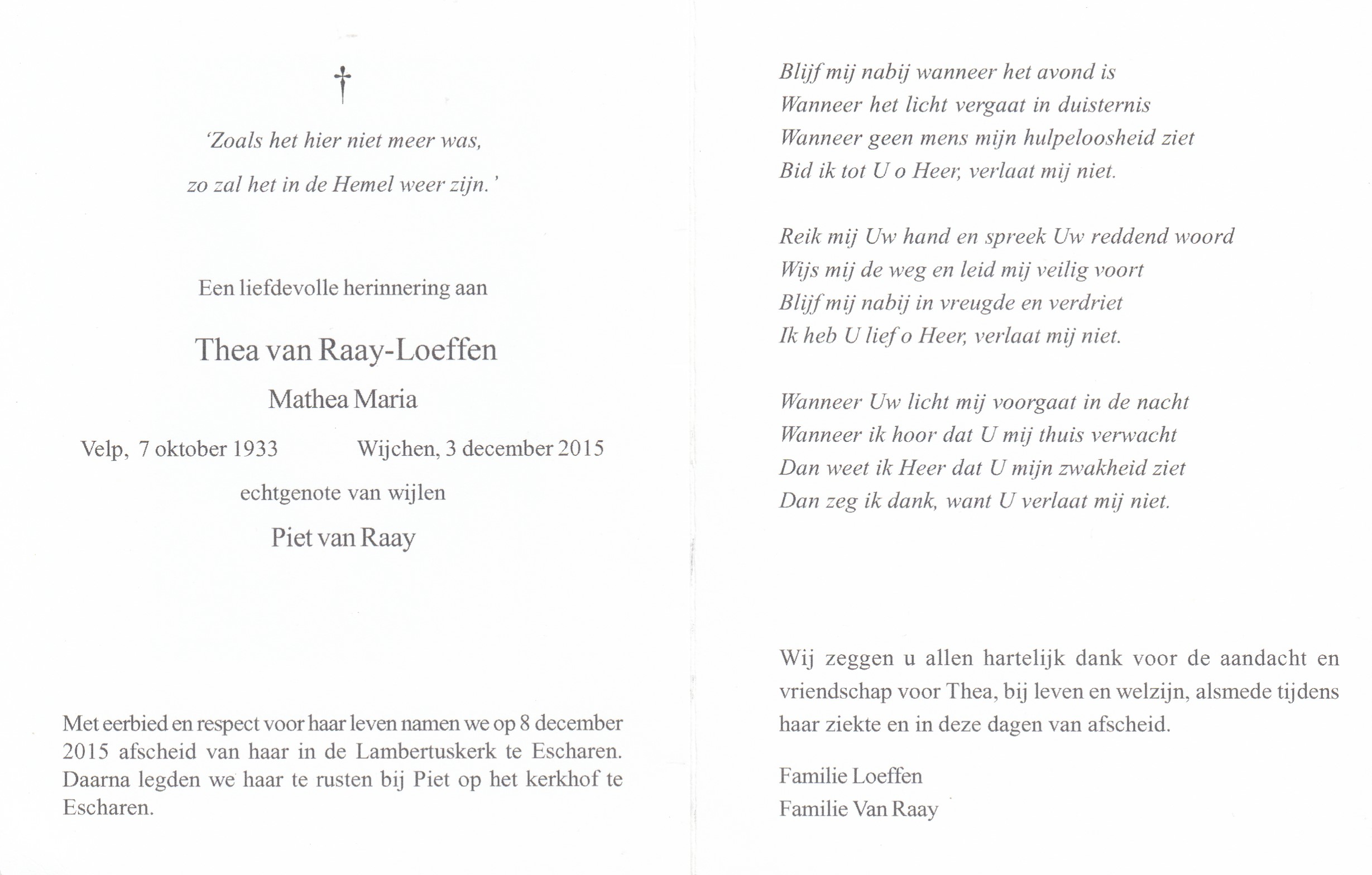 7-10-1933 3-12-2015 Loeffen, Mathea Maria Doopnamen: Mathea Maria Roepnaam: Thea Achternaam: Loeffen Geboren: 7-10-1933, Velp Overleden: 3-12-2015, Wijchen Leeftijd: 82 Partner van: Piet van Raaij Archiefnummer: 11-19-3