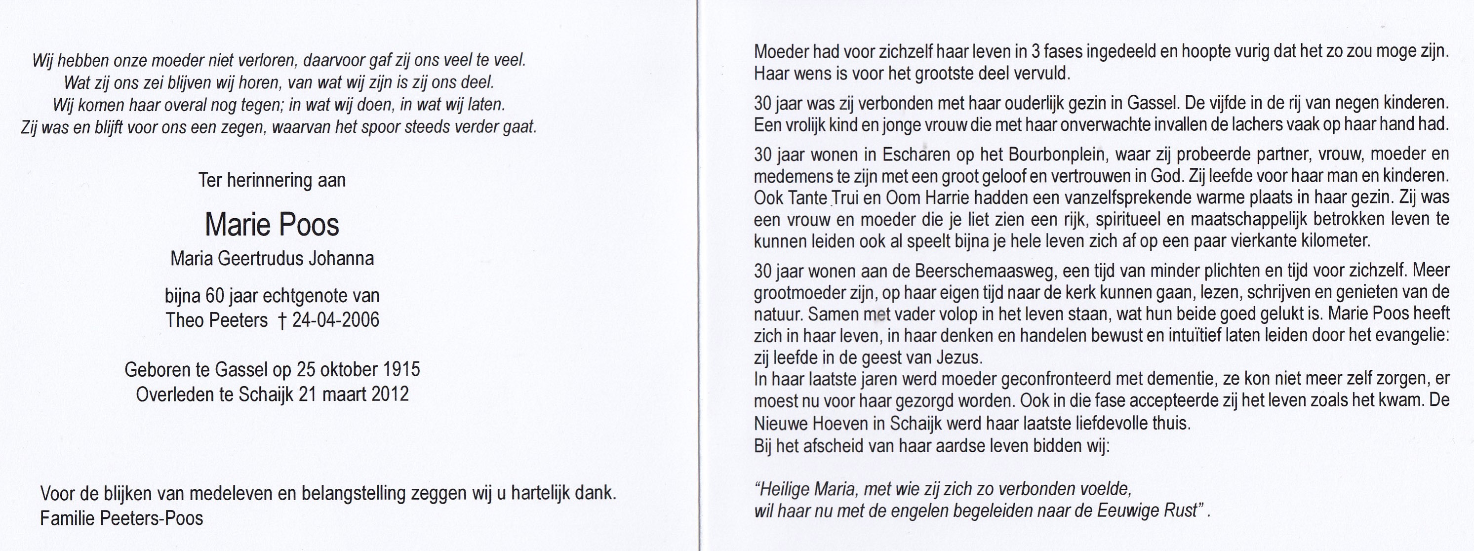 25-10-1915 21-3-2012 Poos, Maria Geertrudus Johanna Doopnamen: Maria Geertrudus Johanna Achternaam: Poos Geboren: 25-10-1915, Gassel Overleden: 21-3-2012, Schaijk Leeftijd: 96 Begrafenis/crematie te: Escharen Partner van: Theo Peeters Archiefnummer: 11-22-3 Terug