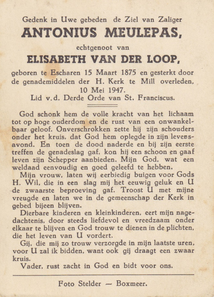 15-3-1875 10-5-1947 Meulepas, Antonius Doopnamen: Antonius Roepnaam: Antoon Achternaam: Meulepas Geboren: 15-3-1875, Escharen Overleden: 10-5-1947, Mill Leeftijd: 72 Begrafenis/crematie te: Mill Partner van: Elisabeth van der Loop Archiefnummer: 11-24-2 Terug