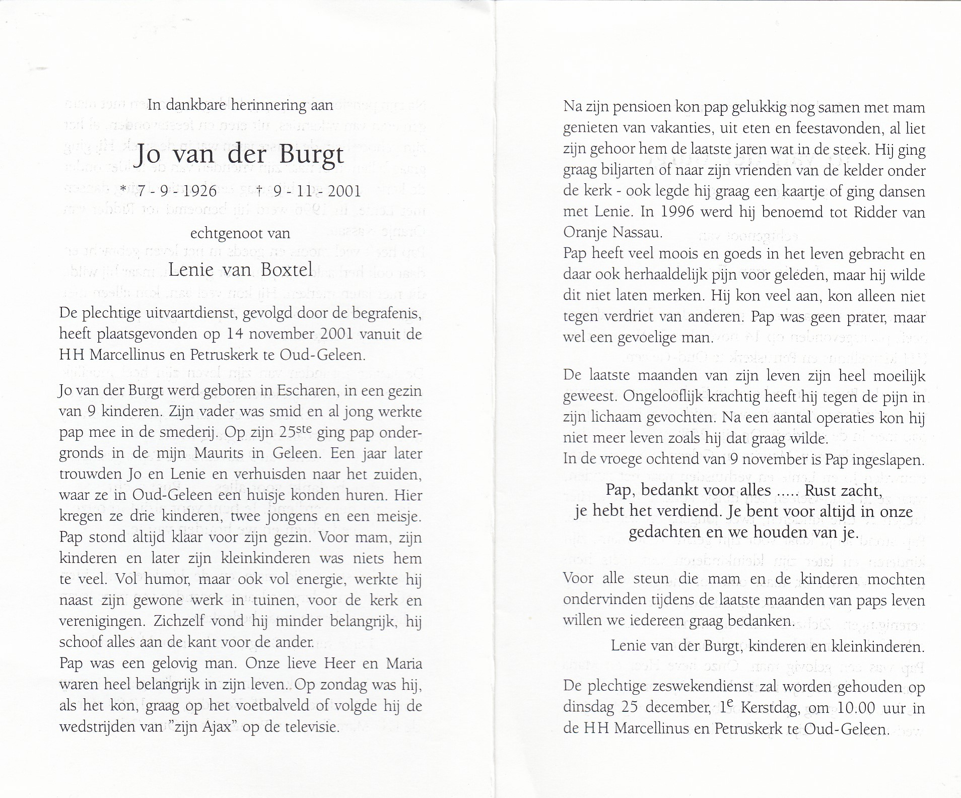 7-9-1926 9-11-2001 Burgt, Jo van der Doopnamen: Jo Roepnaam: Jo Achternaam: van der Burgt Geboren: 7-9-1926, Escharen Overleden: 9-11-2001, Geleen Leeftijd: 75 Begrafenis/crematie te: Geleen Partner van: Lenie van Boxtel Archiefnummer: 11-5-1