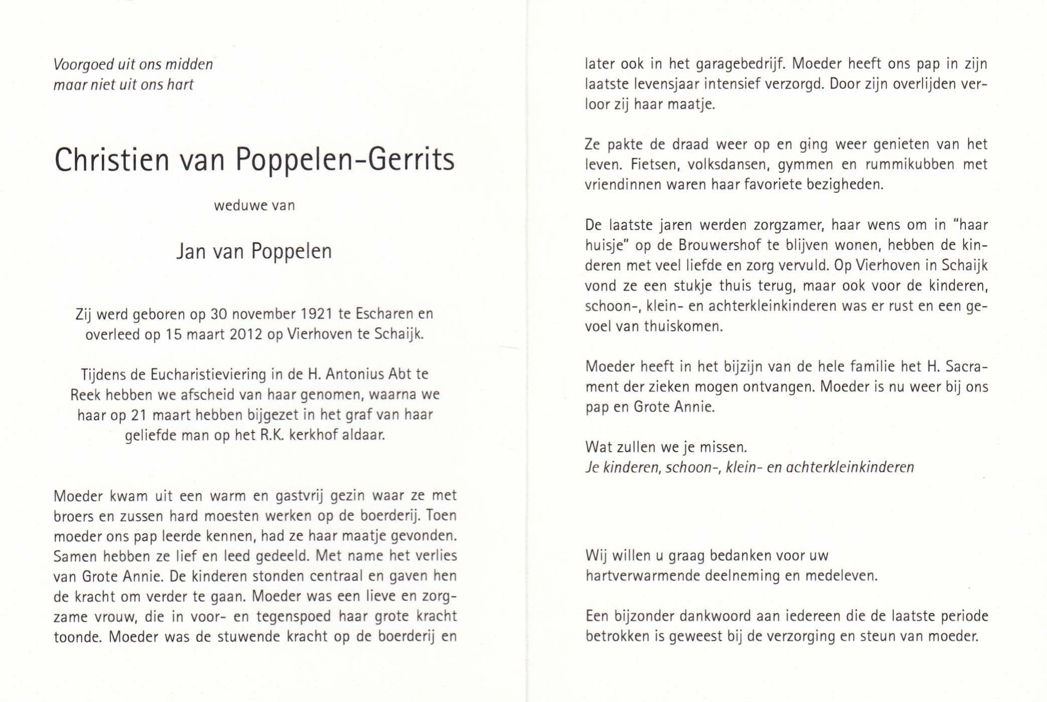 30-11-1921 15-3-2012 Gerrits, Christien Doopnamen: Christien Roepnaam: Christien Achternaam: Gerrits Geboren: 30-11-1921, Escharen Overleden: 15-3-2012, Schaijk Leeftijd: 90 Begrafenis/crematie te: Reek Partner van: Jan van Poppelen Archiefnummer: 12-1-3