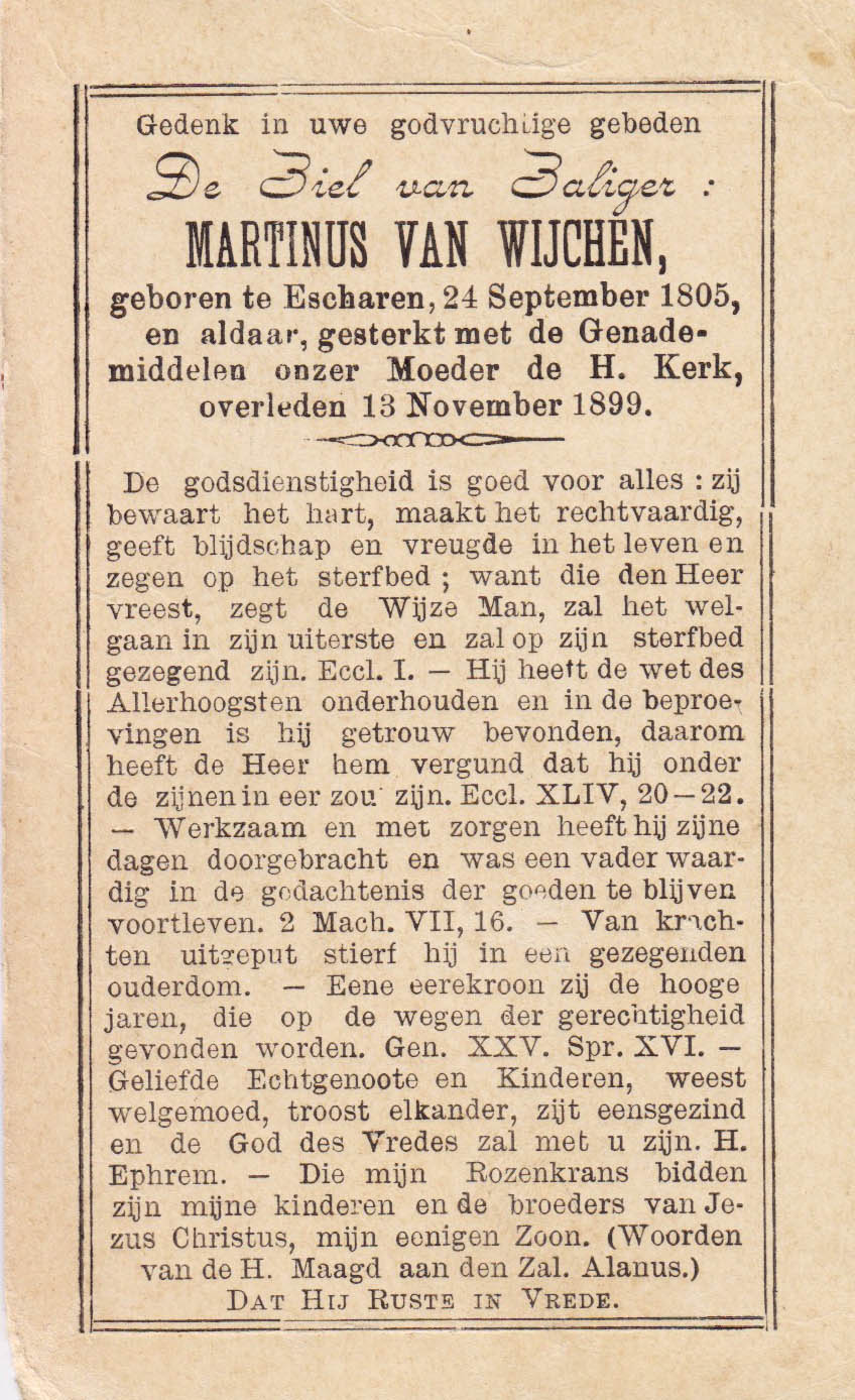 24-9-1805 13-11-1899 Wijchen, Martinus van Doopnamen: Martinus Achternaam: van Wijchen Geboren: 24-9-1805, Escharen Overleden: 13-11-1899, Escharen Leeftijd: 94 Begrafenis/crematie te: Escharen Archiefnummer: 12-19-1