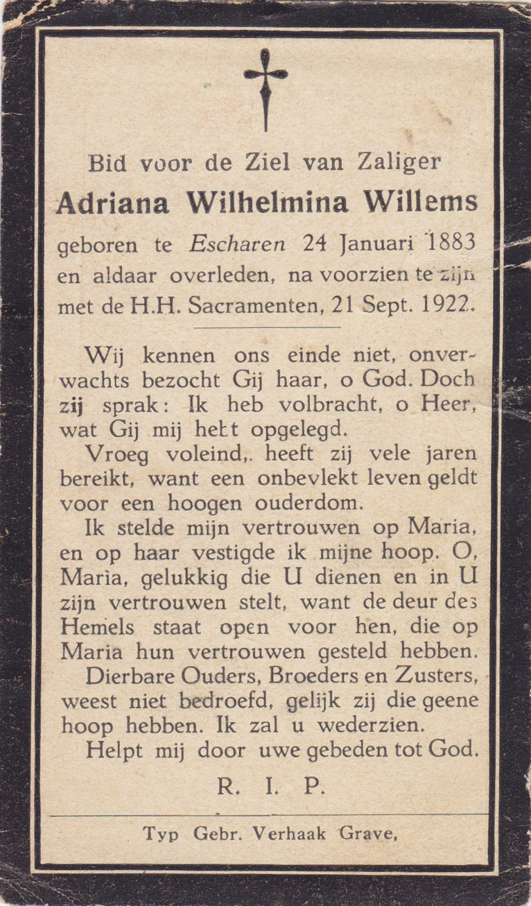 24-1-1883 21-9-1922 Willems, Adriana Wilhelmina Doopnamen: Adriana Wilhelmina Achternaam: Willems Geboren: 24-1-1883, Escharen Overleden: 21-9-1922, Escharen Leeftijd: 39 Begrafenis/crematie te: Escharen Archiefnummer: 12-19-2