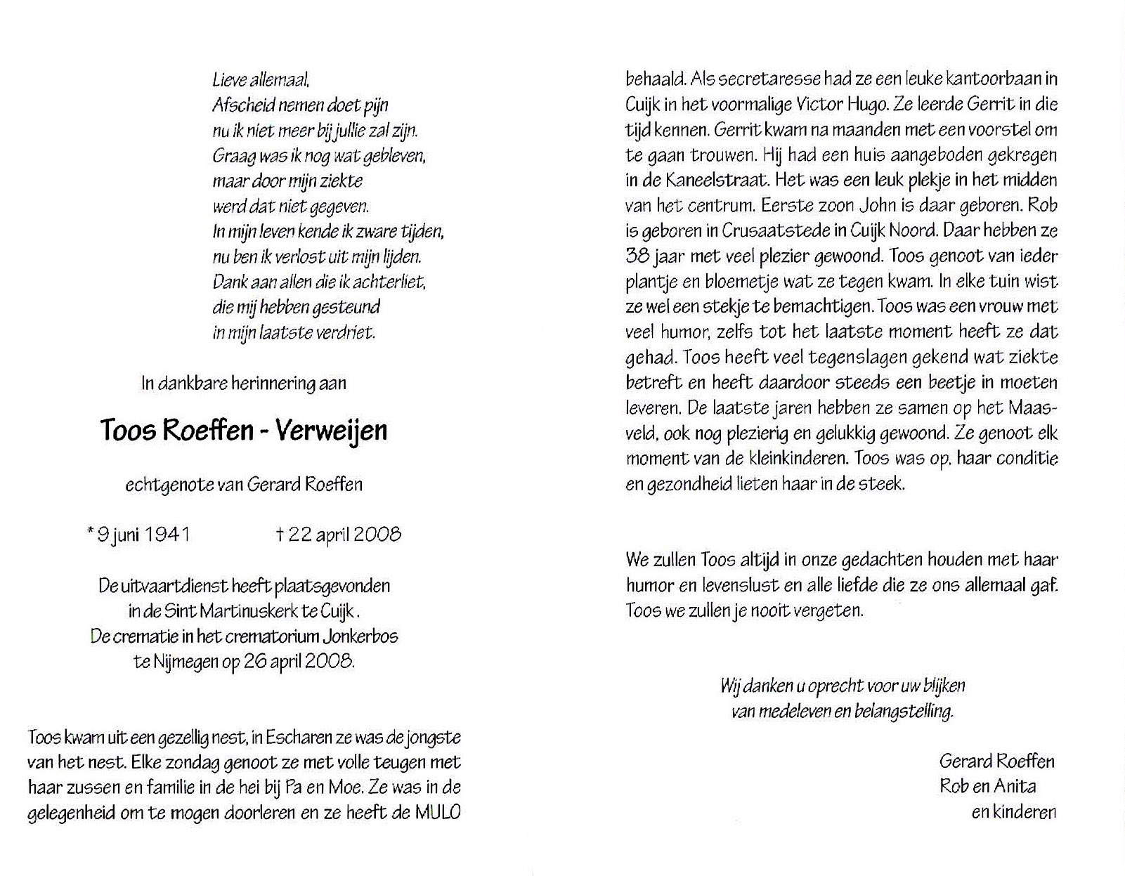 9-6-1941 22-4-2008 Verweijen, Toos Doopnamen: Toos Roepnaam: Toos Achternaam: Verweijen Geboren: 9-6-1941, Escharen Overleden: 22-4-2008, Cuijk Leeftijd: 66 Begrafenis/crematie te: crematie Partner van: Gerard Roeffen Archiefnummer: 12-24-4 k