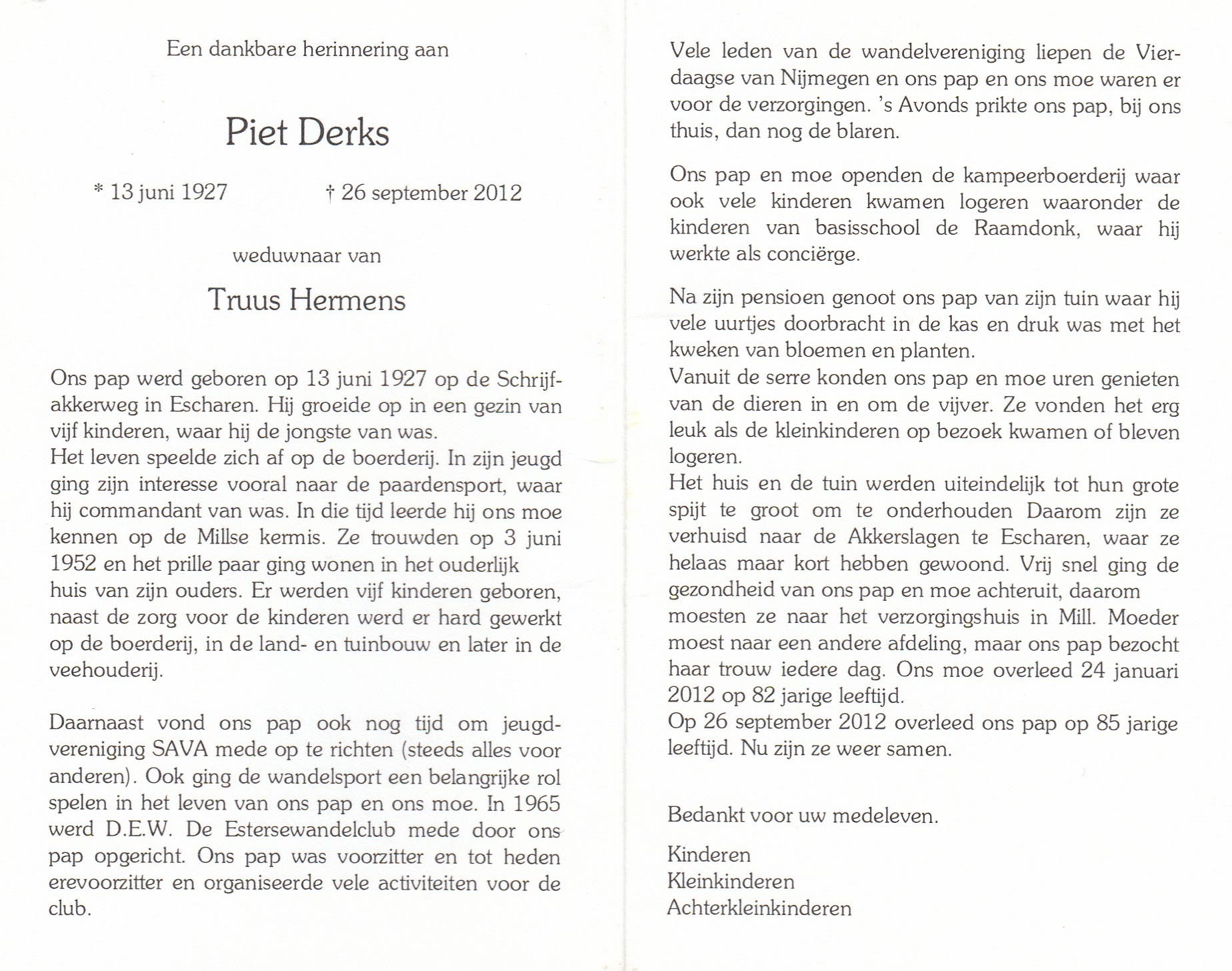 13-6-1927 26-9-2012 Derks, Piet Doopnamen: Piet Roepnaam: Piet Achternaam: Derks Geboren: 13-6-1927, Escharen Overleden: 26-9-2012, Mill Leeftijd: 85 Begrafenis/crematie te: Escharen Partner van: Truus Hermens Archiefnummer: 12-6-1