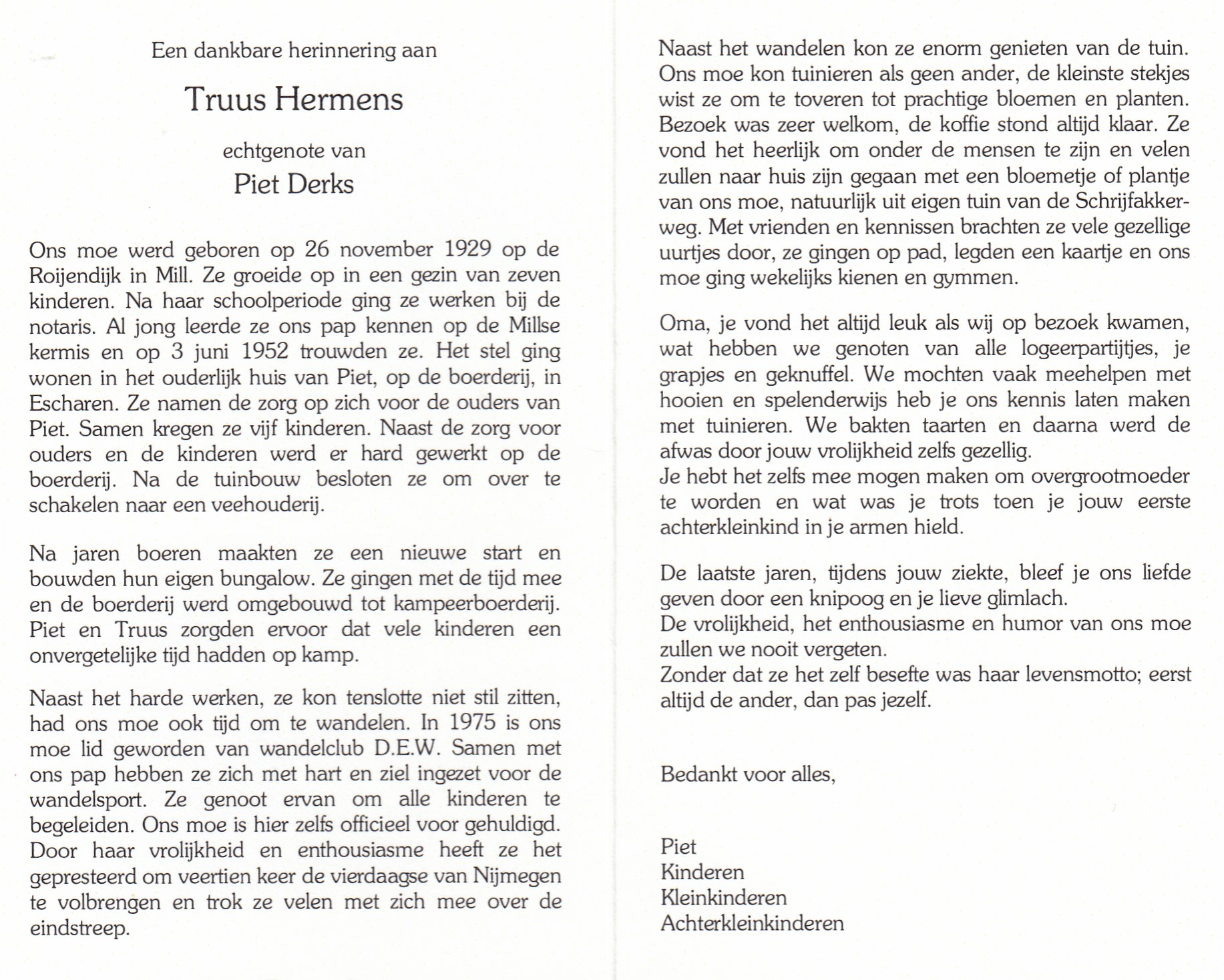 26-11-1929 24-1-2012 Hermens, Truus Doopnamen: Truus Roepnaam: Truus Achternaam: Hermens Geboren: 26-11-1929, Mill Overleden: 24-1-2012, Mill Leeftijd: 82 Begrafenis/crematie te: Escharen Partner van: Piet Derks Archiefnummer: 12-6-3 Terug