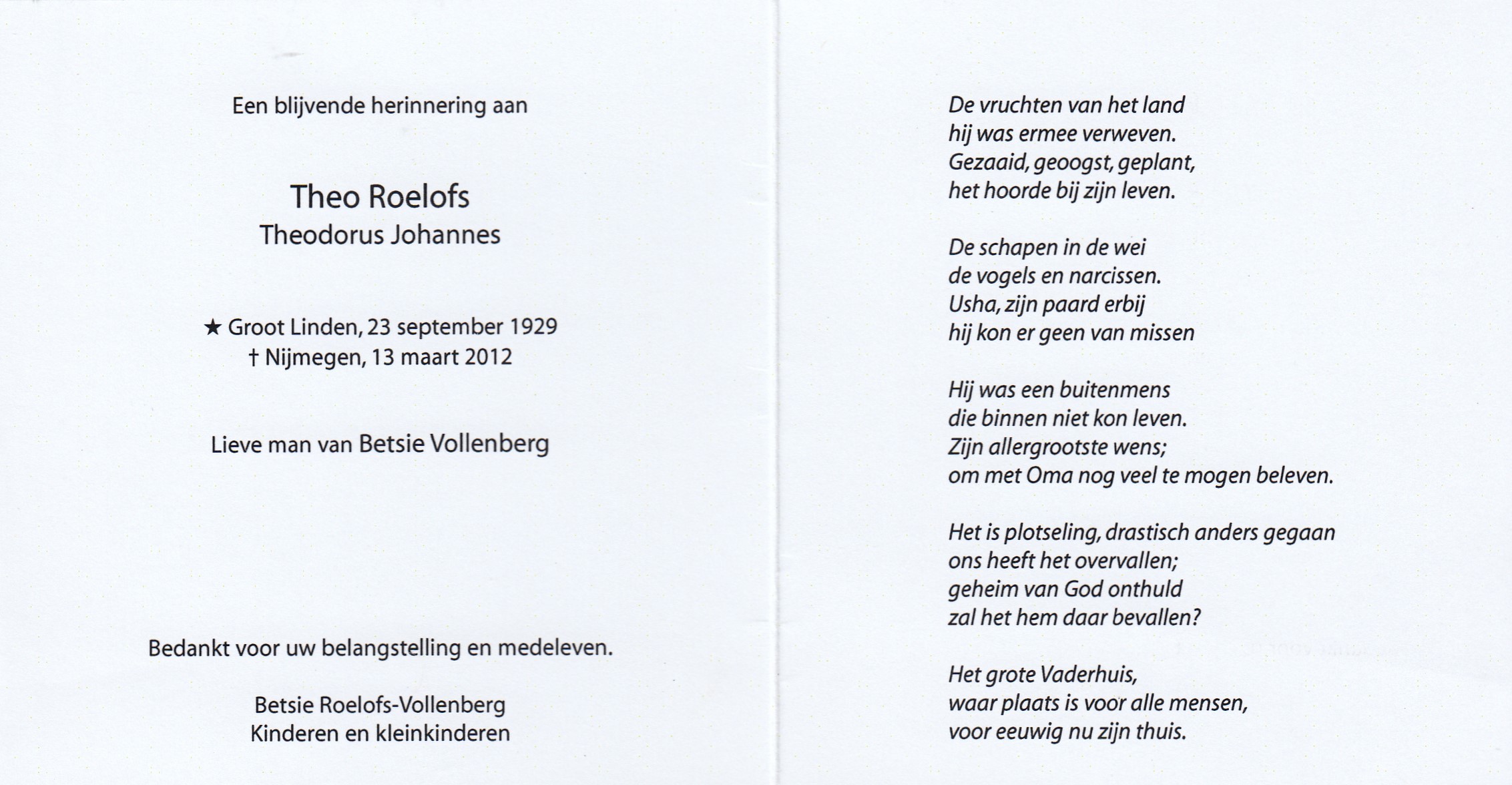 23-9-1929 13-3-2012 Roelofs, Theodorus Johannes Doopnamen: Theodorus Johannes Roepnaam: Theo Achternaam: Roelofs Geboren: 23-9-1929, Groot Linden Overleden: 13-3-2012, Nijmegen Leeftijd: 82 Partner van: Betsie Vollenberg Archiefnummer: 12-8-1