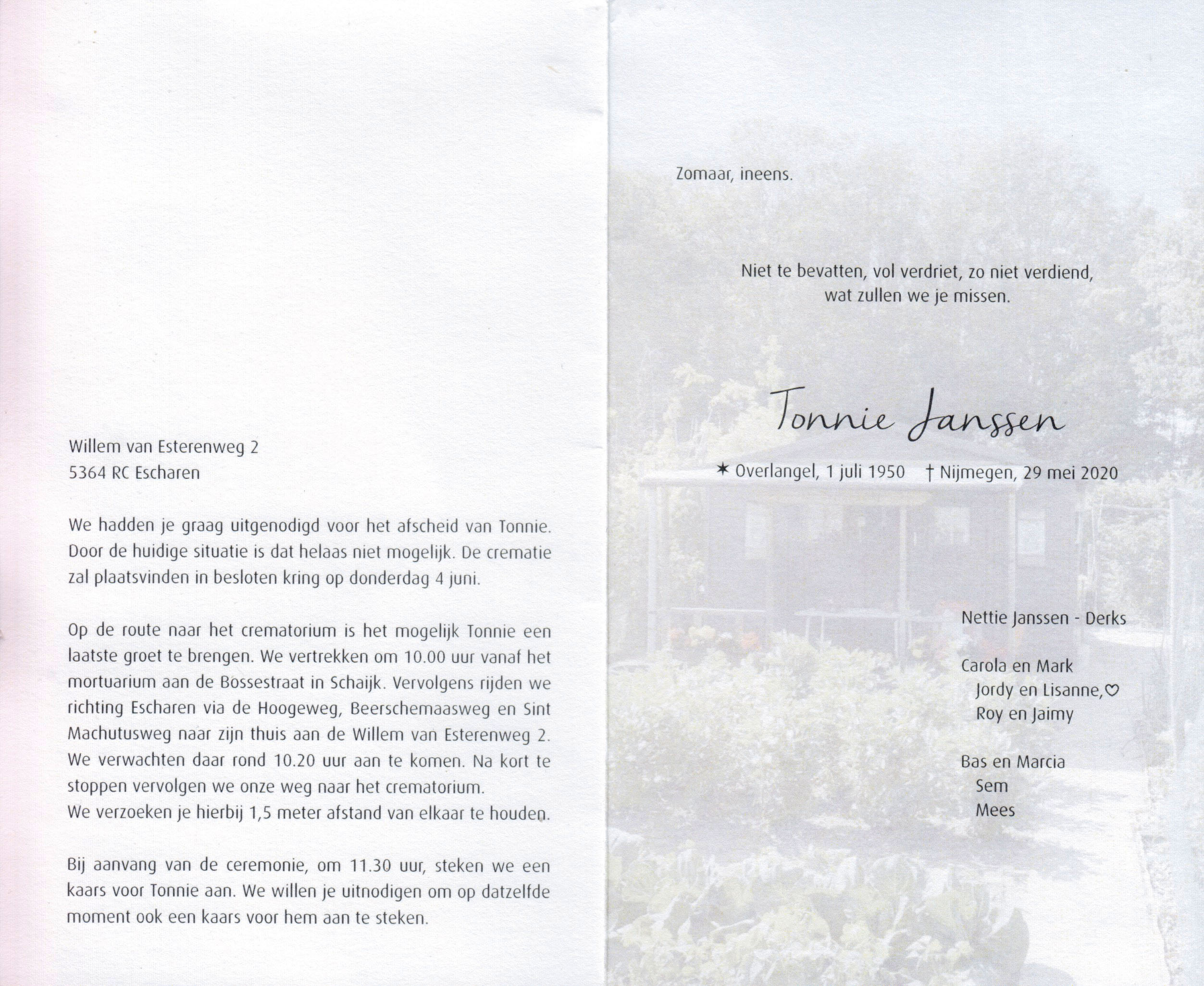 1-7-1950 29-5-2020 Janssen, Tonnie Doopnamen: Tonnie Achternaam: Janssen Geboren: 1-7-1950, Overlangel Overleden: 29-5-2020, Nijmegen Leeftijd: 69 Partner van: Nettie Derks Archiefnummer: 13-13-2 Terug