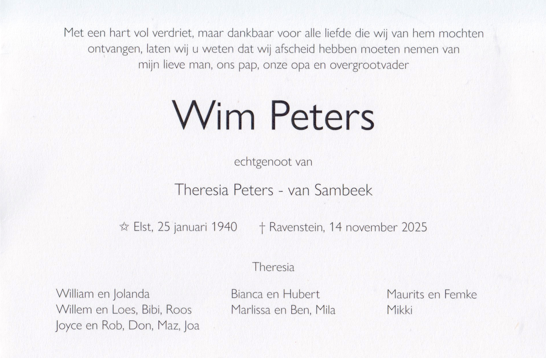 25-1-1940 14-11-2025 Peters, Wim Doopnamen: Wim Achternaam: Peters Geboren: 25-1-1940, Elst Overleden: 14-11-2025, Ravenstein Leeftijd: 85 Partner van: Theresia van Sambeek Archiefnummer: 13-17-1