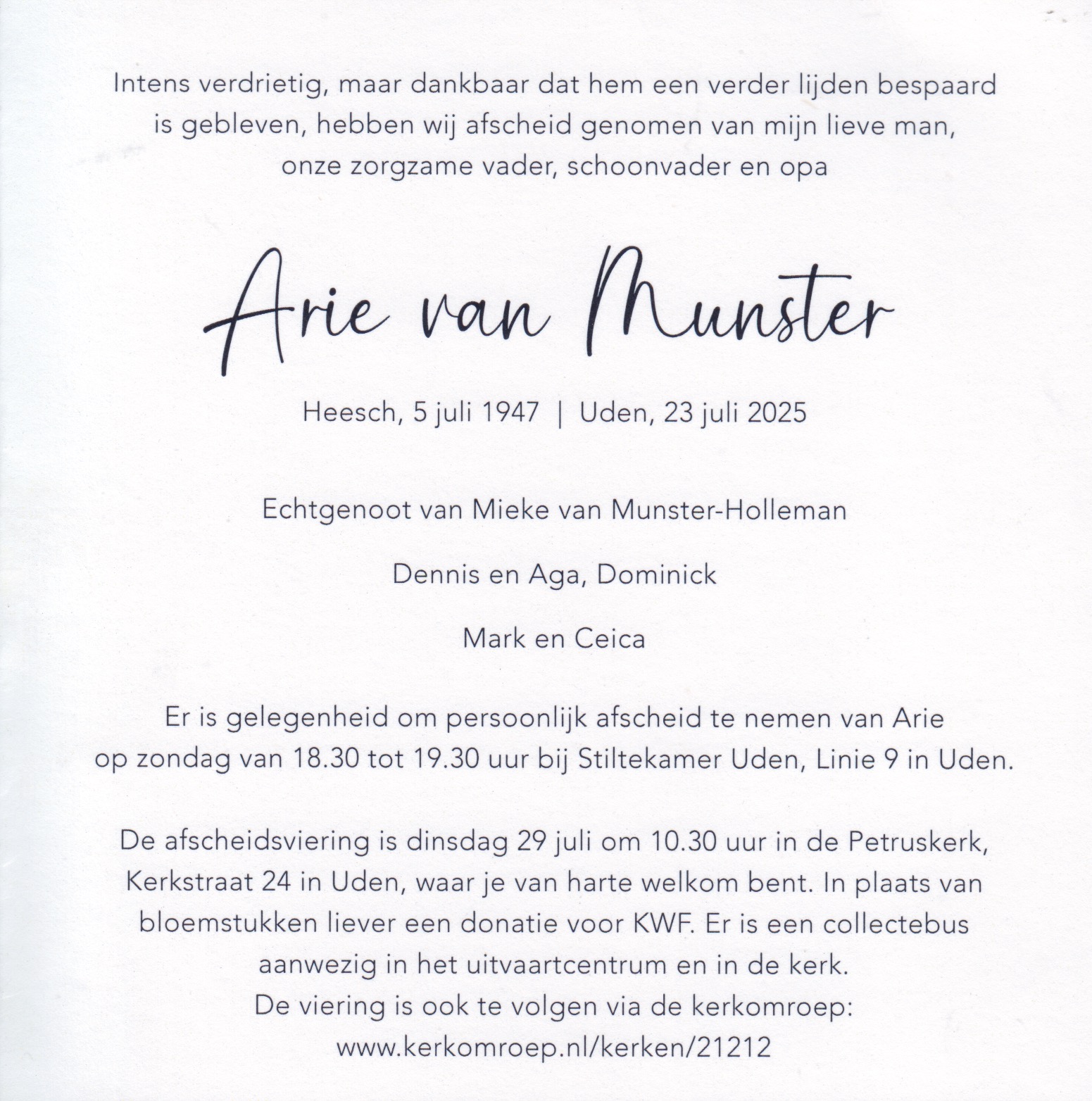 5-7-1947 23-7-2025 Munster, Arie van Doopnamen: Arie Achternaam: van Munster Geboren: 5-7-1947, Heesch Overleden: 23-7-2025, Uden Leeftijd: 78 Partner van: Mieke Holleman Archiefnummer: 13-18-2
