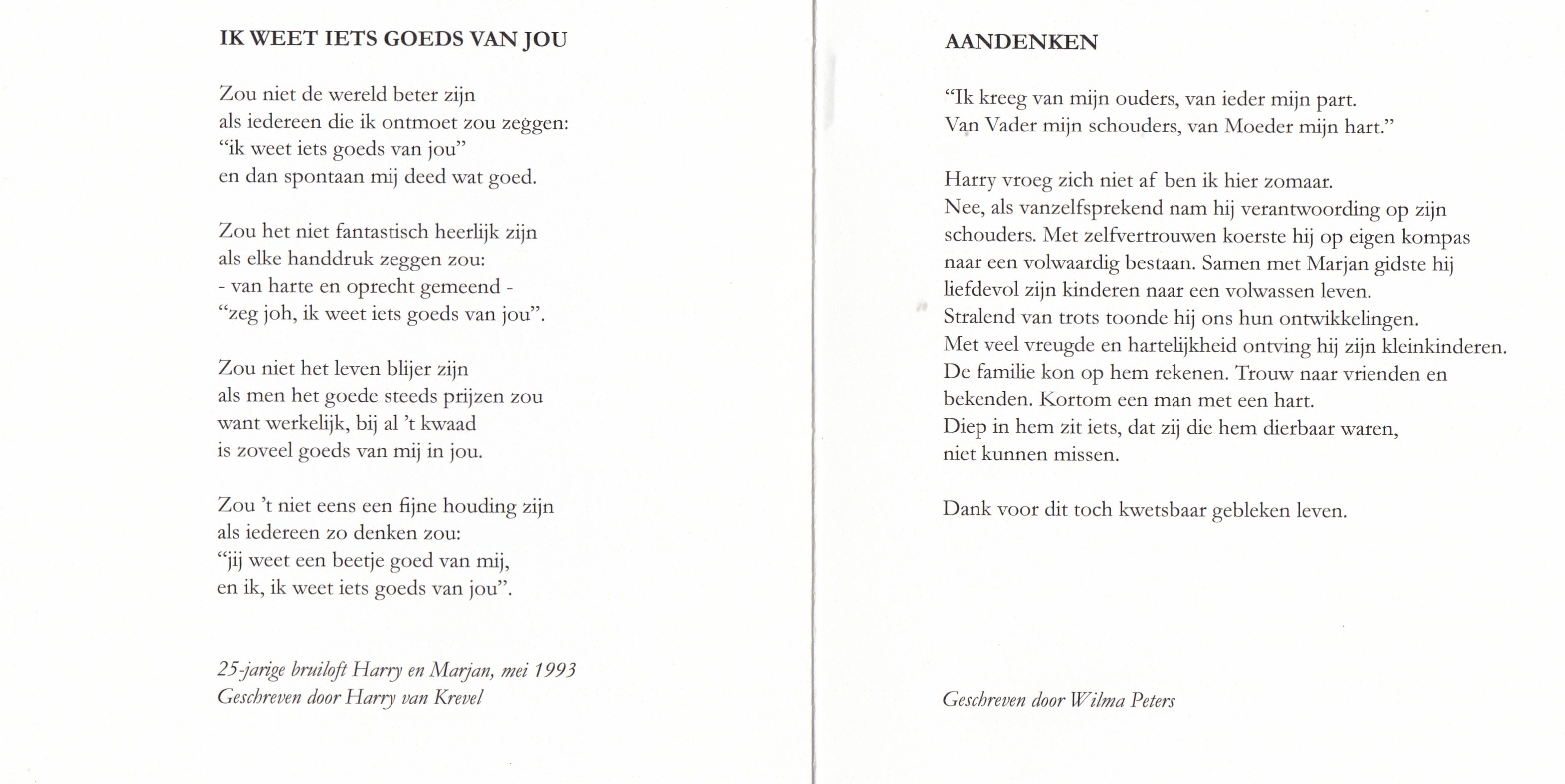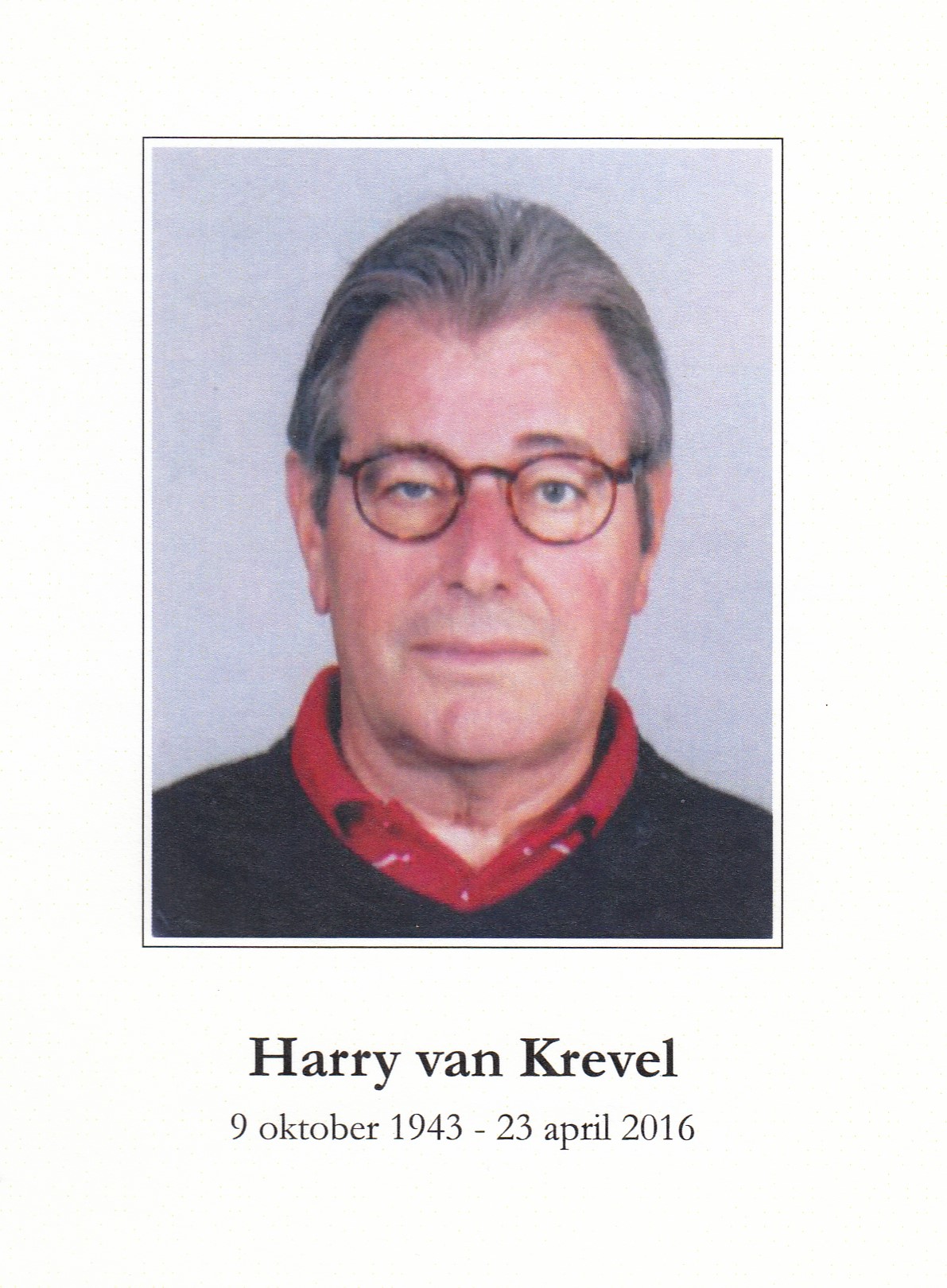 9-10-1943 23-4-2016 Krevel, Harry van Doopnamen: Harry Roepnaam: Harry Achternaam: van Krevel Geboren: 9-10-1943, Overleden: 23-4-2016, Escharen Leeftijd: 72 Partner van: Marjan Peters Archiefnummer: 13-2-1