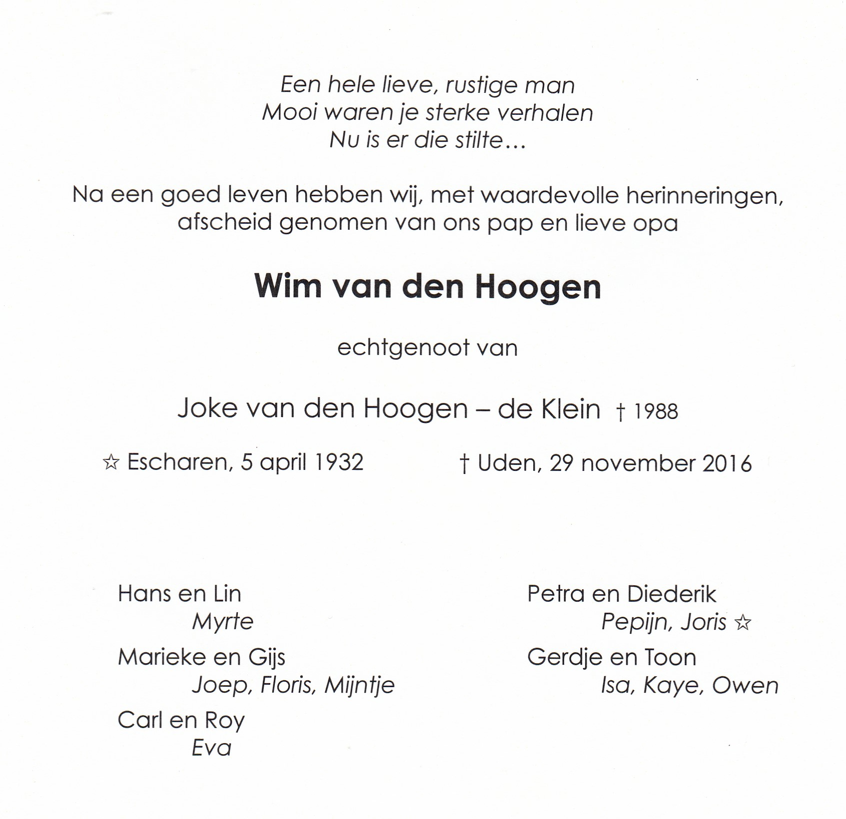 5-4-1932 29-11-2016 Hoogen, Wilhelmus Josephus van den Doopnamen: Wilhelmus Josephus Roepnaam: Wim Achternaam: van den Hoogen Geboren: 5-4-1932, Escharen Overleden: 29-11-2016, Uden Leeftijd: 84 Begrafenis/crematie te: Escharen Partner van: Joke de Klein Archiefnummer: 13-2-2