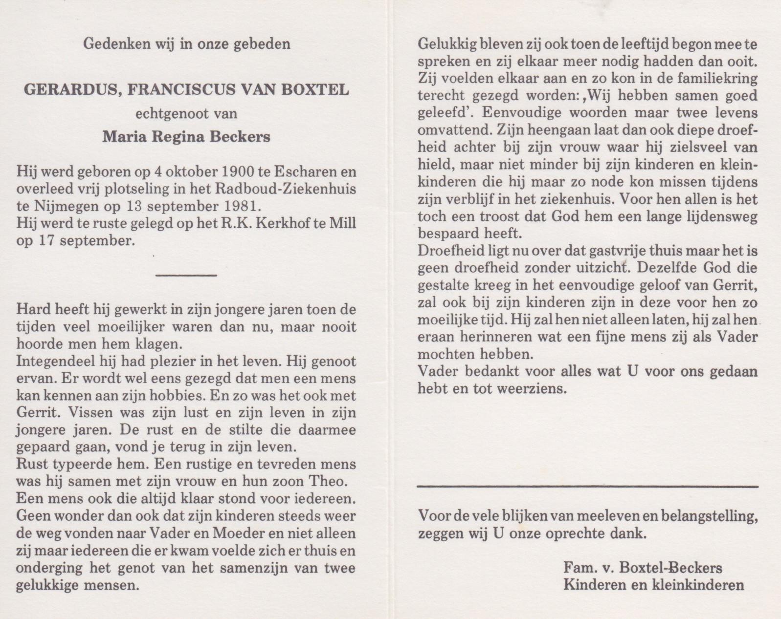 4-10-1900 13-9-1981 Boxtel, Gerardus Franciscus van Doopnamen: Gerardus Franciscus Achternaam: van Boxtel Geboren: 4-10-1900, Escharen Overleden: 13-9-1981, Nijmegen Leeftijd: 80 Begrafenis/crematie te: Mill Partner van: Maria Regina Beckers Archiefnummer: 14-16-4