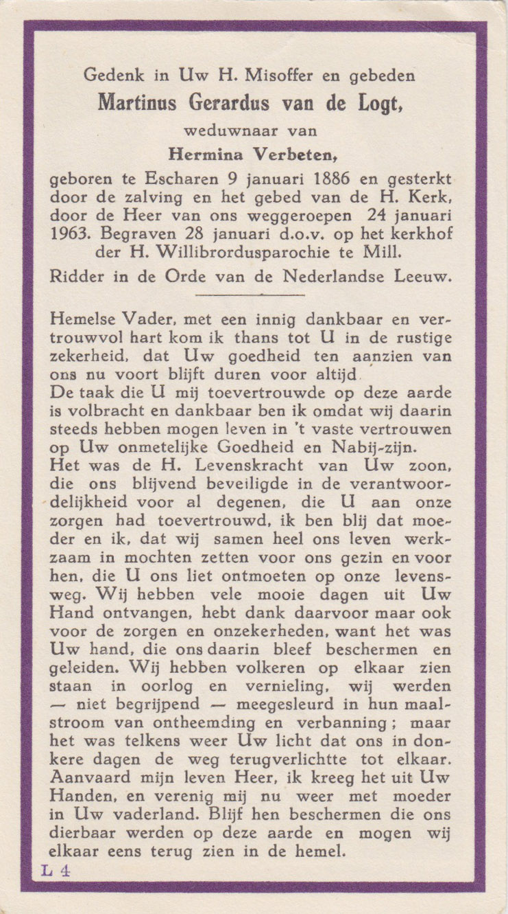 9-1-1886 24-1-1963 Logt, Martinus Gerardus van de Doopnamen: Martinus Gerardus Achternaam: van de Logt Geboren: 9-1-1886, Escharen Overleden: 24-1-1963, Mill Leeftijd: 77 Begrafenis/crematie te: Mill Partner van: Hermina Verbeten Archiefnummer: 14-2-6
