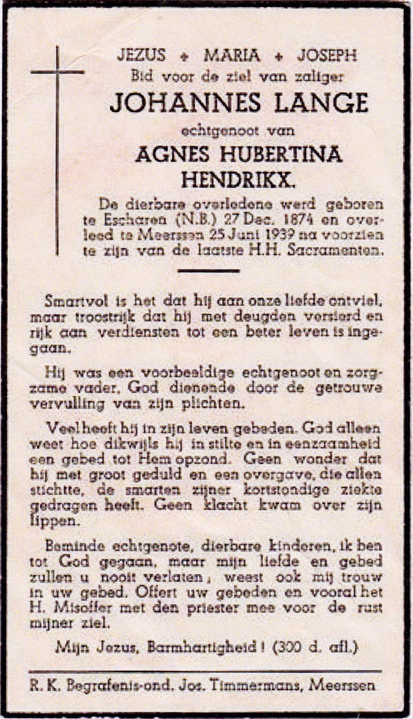 27-12-1874 25-7-1939 Lange, Johannes Doopnamen: Johannes Achternaam: Lange Geboren: 27-12-1874, Escharen Overleden: 25-7-1939, Meerssen Leeftijd: 64 Begrafenis/crematie te: Meerssen Partner van: Agnes H. Hendrikx Archiefnummer: 14-3-5 k
