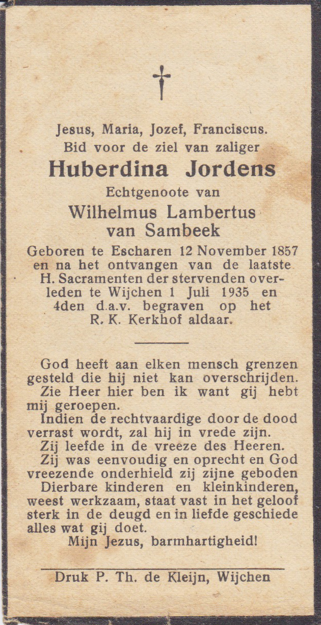 12-11-1857 1-7-1935 Jordens, Huberdina Doopnamen: Huberdina Achternaam: Jordens Geboren: 12-11-1857, Escharen Overleden: 1-7-1935, Wijchen Leeftijd: 77 Begrafenis/crematie te: Wijchen Partner van: Wilhelmus L. v. Sambeek Archiefnummer: 14-4-2 k