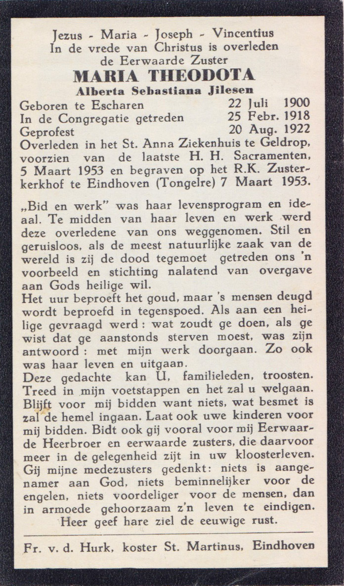 22-7-1900 5-3-1953 Jilesen, Alberta Sebastiana Doopnamen: Alberta Sebastiana Roepnaam: Zuster Maria Theodota Achternaam: Jilesen Geboren: 22-7-1900, Escharen Overleden: 5-3-1953, Eindhoven Leeftijd: 52 Begrafenis/crematie te: Tongelre Archiefnummer: 14-4-3