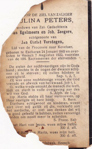 24-1-1849 7-8-1922 Peters, Paulina Doopnamen: Paulina Achternaam: Peters Geboren: 24-1-1849, Escharen Overleden: 7-8-1922, Heesch Leeftijd: 73 Begrafenis/crematie te: Heesch Partner van: Jan Christ. Verstegen Eerder gehuwd met: Jan Egelmeers en Joh. Zeegers Archiefnummer: 14-4-4 k