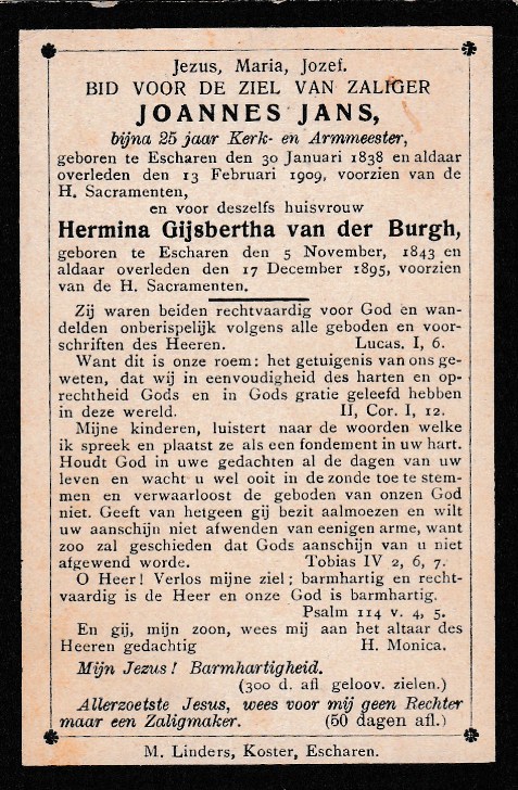30-1-1838 13-2-1909 Jans, Joannes Doopnamen: Joannes Achternaam: Jans Geboren: 30-1-1838, Escharen Overleden: 13-2-1909, Escharen Leeftijd: 71 Begrafenis/crematie te: Escharen Partner van: Hermina G. Van der Burgt Archiefnummer: 14-6-6-1 k