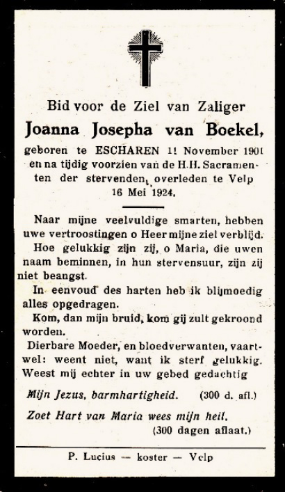 11-11-1900 16-5-1924 Boekel, Joanna Josepha van Doopnamen: Joanna Josepha Achternaam: van Boekel Geboren: 11-11-1900, Escharen Overleden: 16-5-1924, Velp Leeftijd: 23 Archiefnummer: 14-9-5 k