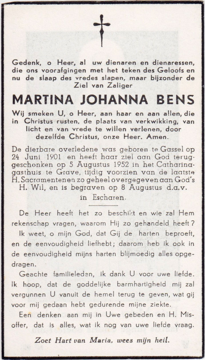 24-6-1901 5-8-1952 Bens, Martina Johanna Doopnamen: Martina Johanna Achternaam: Bens Geboren: 24-6-1901, Gassel Overleden: 5-8-1952, Grave Leeftijd: 51 Begrafenis/crematie te: Escharen Archiefnummer: 15-10-4