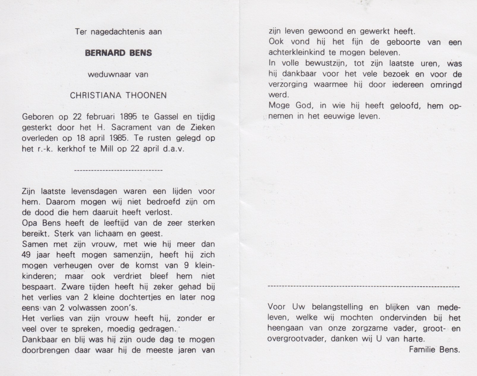 22-2-1895 18-4-1985 Bens, Bernardus Doopnamen: Bernardus Roepnaam: Bernard Achternaam: Bens Geboren: 22-2-1895, Gassel Overleden: 18-4-1985, Mill Leeftijd: 90 Partner van: Christina Thoonen Archiefnummer: 15-11-2 k