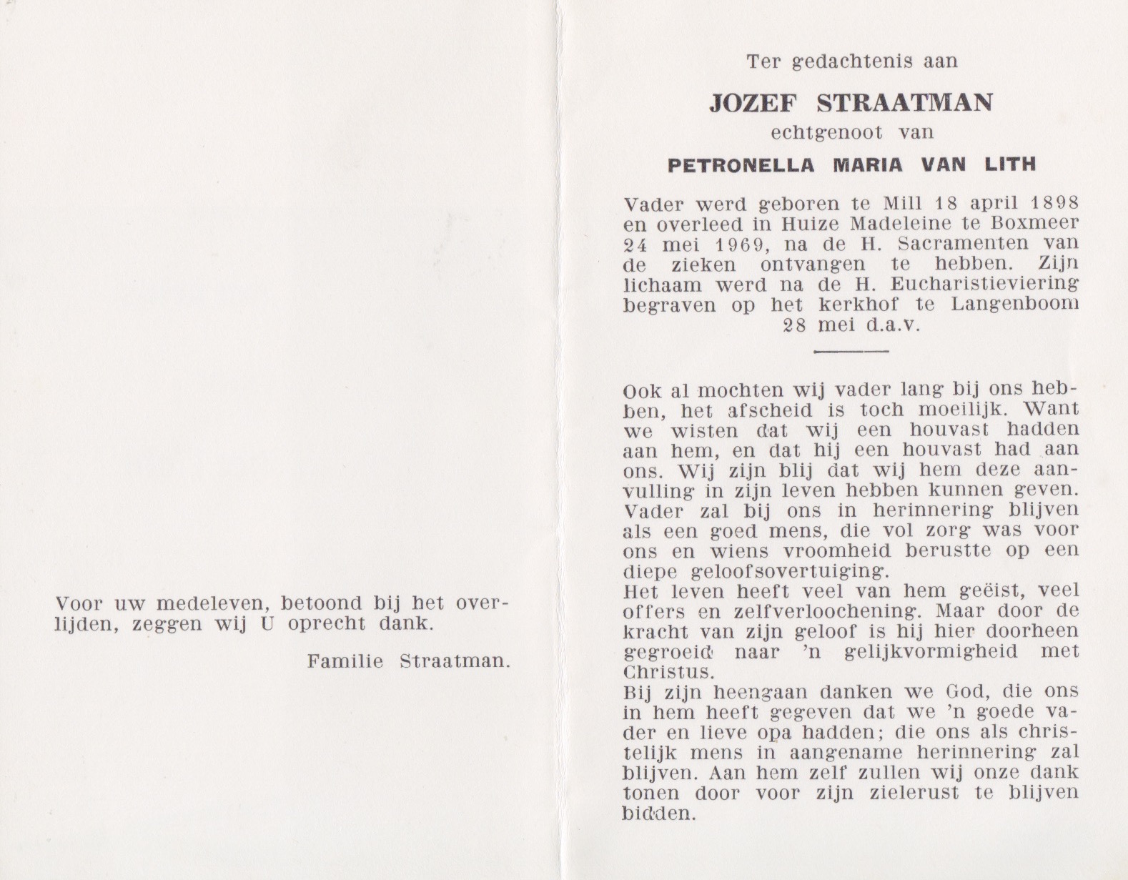 18-4-1898 24-5-1969 Straatman, Jozef Doopnamen: Jozef Achternaam: Straatman Geboren: 18-4-1898, Mill Overleden: 24-5-1969, Boxmeer Leeftijd: 71 Begrafenis/crematie te: Langenboom Partner van: Petronella Maria van Lith Archiefnummer: 15-21-4 Terug