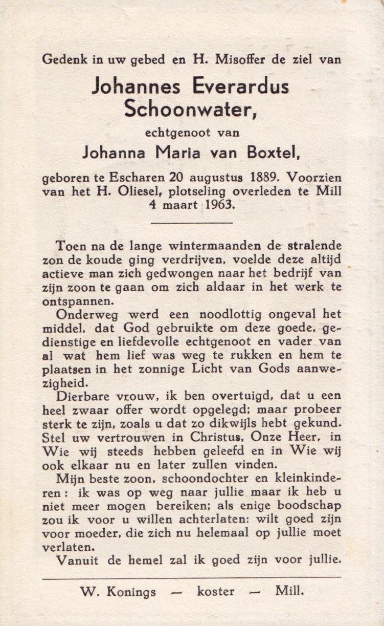 20-8-1889 4-3-1963 Schoonwater, Johannes Everardus Doopnamen: Johannes Everardus Achternaam: Schoonwater Geboren: 20-8-1889, Escharen Overleden: 4-3-1963, Mill Leeftijd: 73 Partner van: Johanna Maria van Boxtel Archiefnummer: 15-22-2