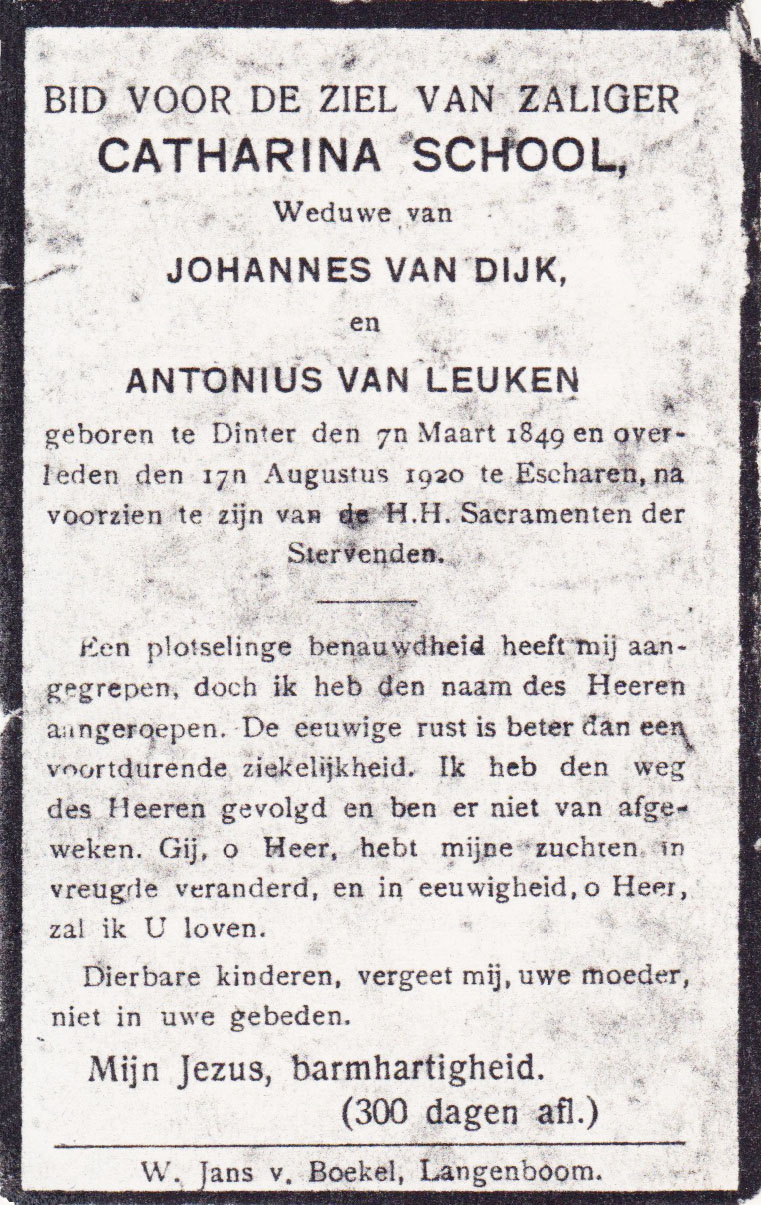 7-3-1849 17-8-1920 School, Catharina Doopnamen: Catharina Achternaam: School Geboren: 7-3-1849, Dinter Overleden: 17-8-1920, Escharen Leeftijd: 71 Begrafenis/crematie te: Escharen Partner van: Johannes van Dijk Eerder gehuwd met: Antonius van Leuken Archiefnummer: 15-26-3 k