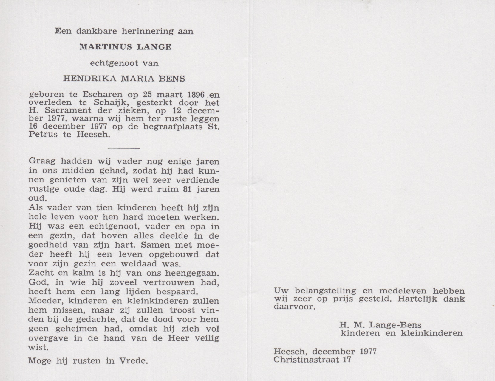 25-3-1896 12-12-1977 Lange, Martinus Doopnamen: Martinus Achternaam: Lange Geboren: 25-3-1896, Escharen Overleden: 12-12-1977, Schaijk Leeftijd: 81 Begrafenis/crematie te: Heesch Partner van: Hendrika Bens Archiefnummer: 15-7-4