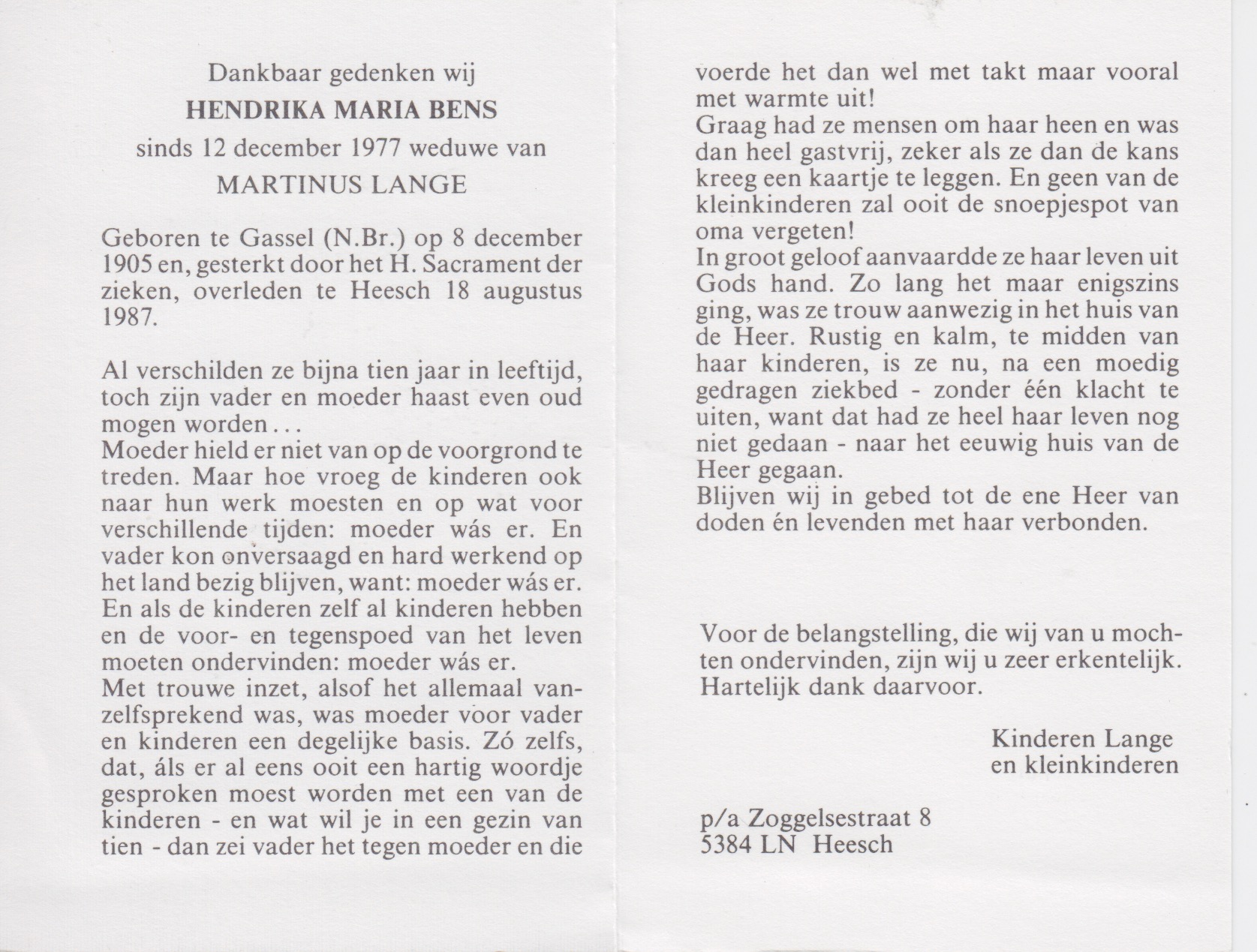 8-12-1905 18-8-1987 Bens, Hendrika Maria Doopnamen: Hendrika Maria Achternaam: Bens Geboren: 8-12-1905, Gassel Overleden: 18-8-1987, Heesch Leeftijd: 81 Partner van: Marinus Lange Archiefnummer: 15-7-5 k Terug