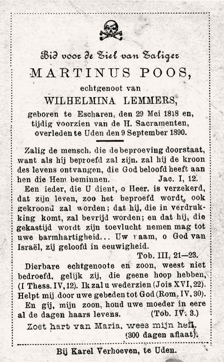 29-5-1818 9-9-1890 Poos, Martinus Doopnamen: Martinus Achternaam: Poos Geboren: 29-5-1818, Escharen Overleden: 9-9-1890, Uden Leeftijd: 72 Partner van: Wilhelmina Lemmers Archiefnummer: 15-9-1 k