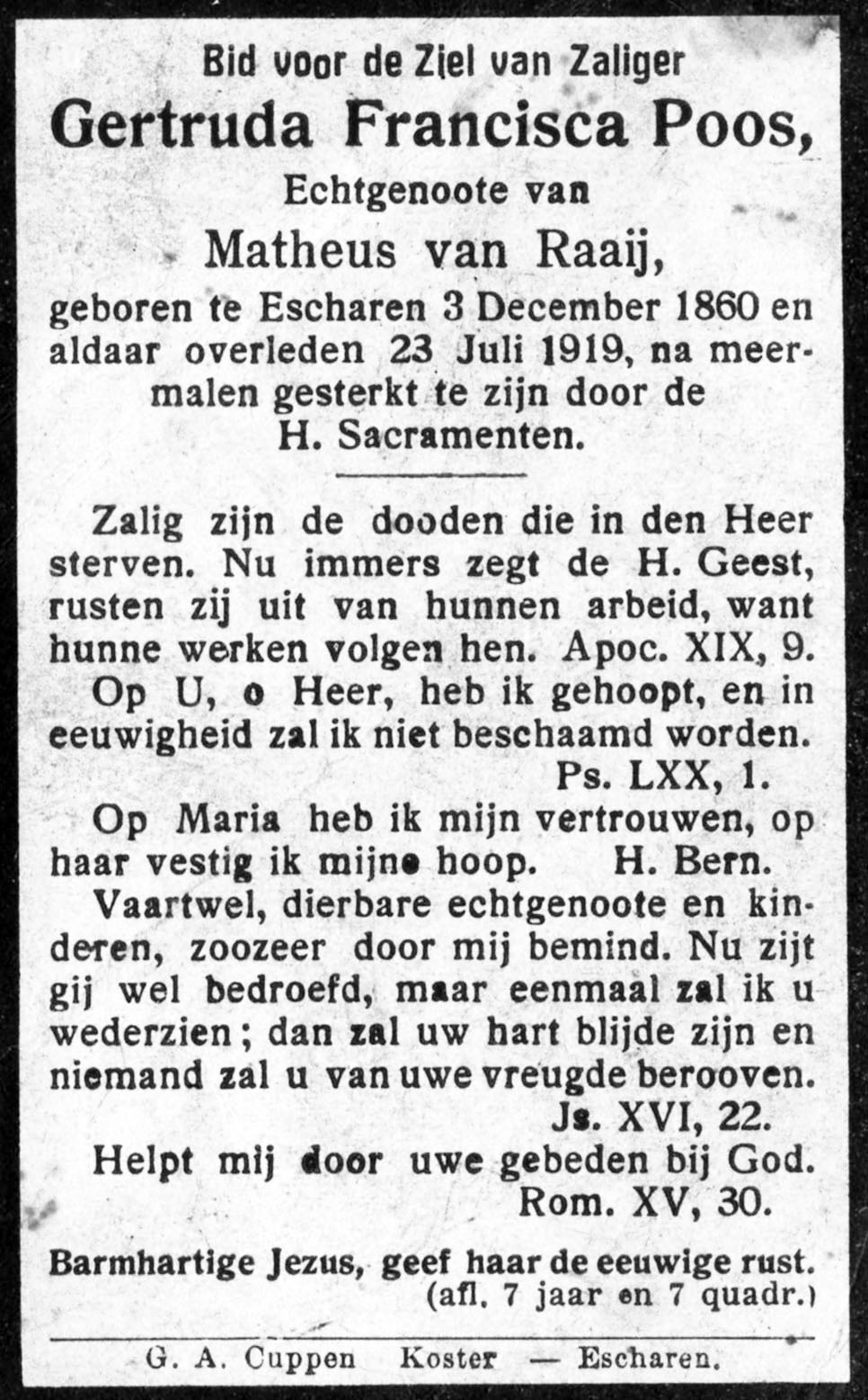 3-12-1860 23-7-1919 Poos, Gertruda Francisca Doopnamen: Gertruda Francisca Achternaam: Poos Geboren: 3-12-1860, Escharen Overleden: 23-7-1919, Escharen Leeftijd: 58 Partner van: Matheus van Raaij Archiefnummer: 15-9-2 k