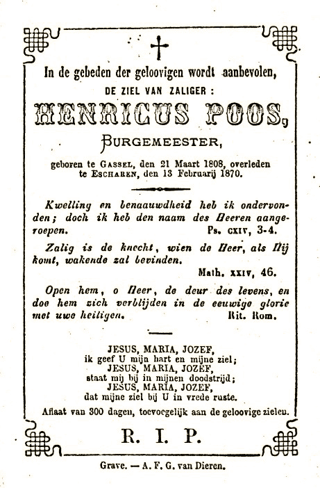 21-3-1808 13-2-1870 Poos, Henricus Doopnamen: Henricus Achternaam: Poos Geboren: 21-3-1808, Gassel Overleden: 13-2-1870, Escharen Leeftijd: 61 Begrafenis/crematie te: Escharen Archiefnummer: 15-9-3 k